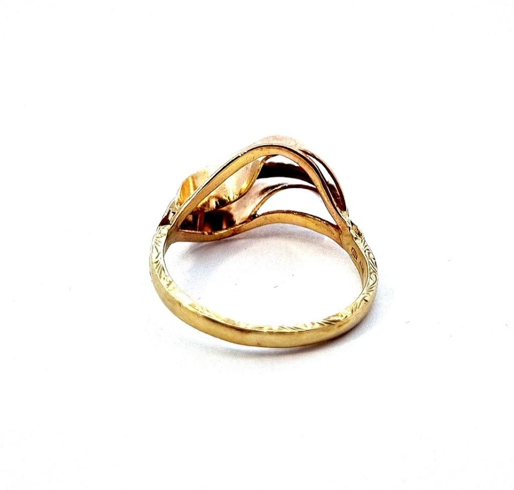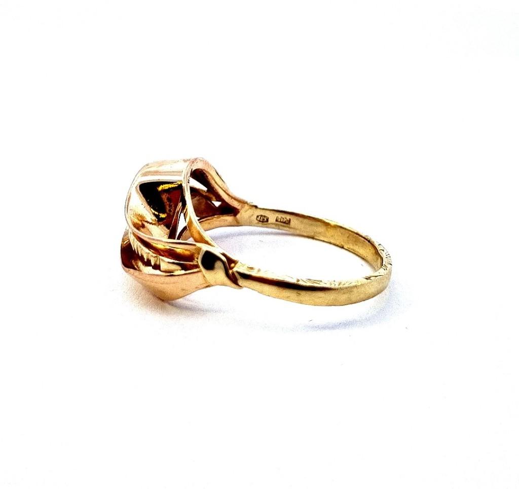 Zlatý prsten o ryzosti 585/1000, punc labuť, váha 4,15 g, velikost 61,5, v nejširším bodě 11 mm.