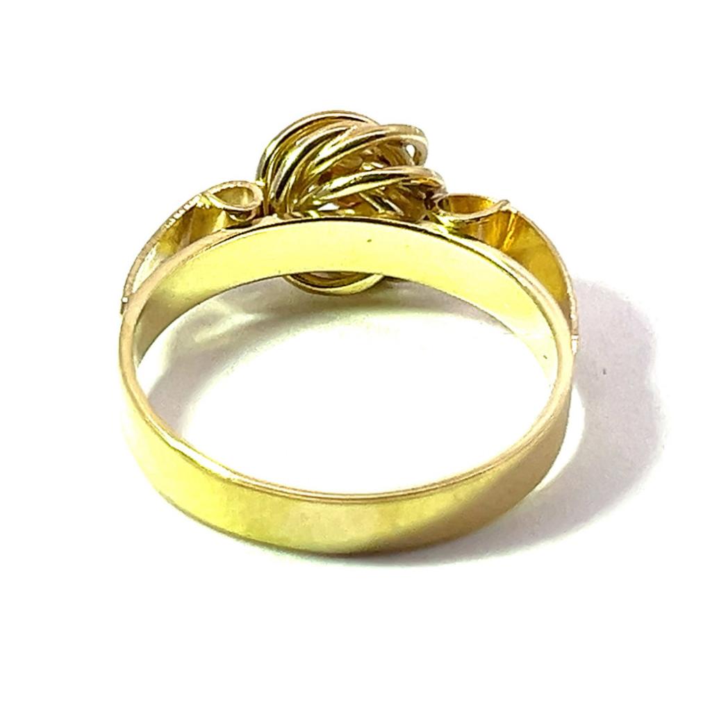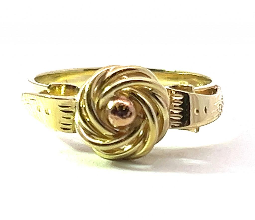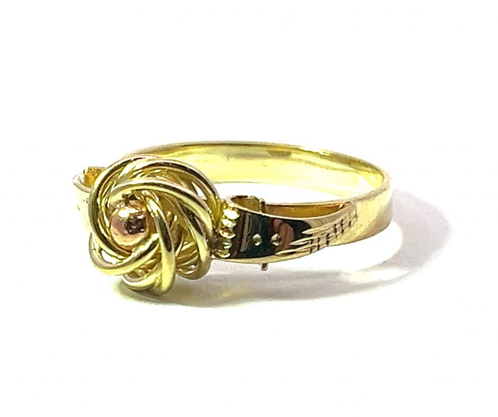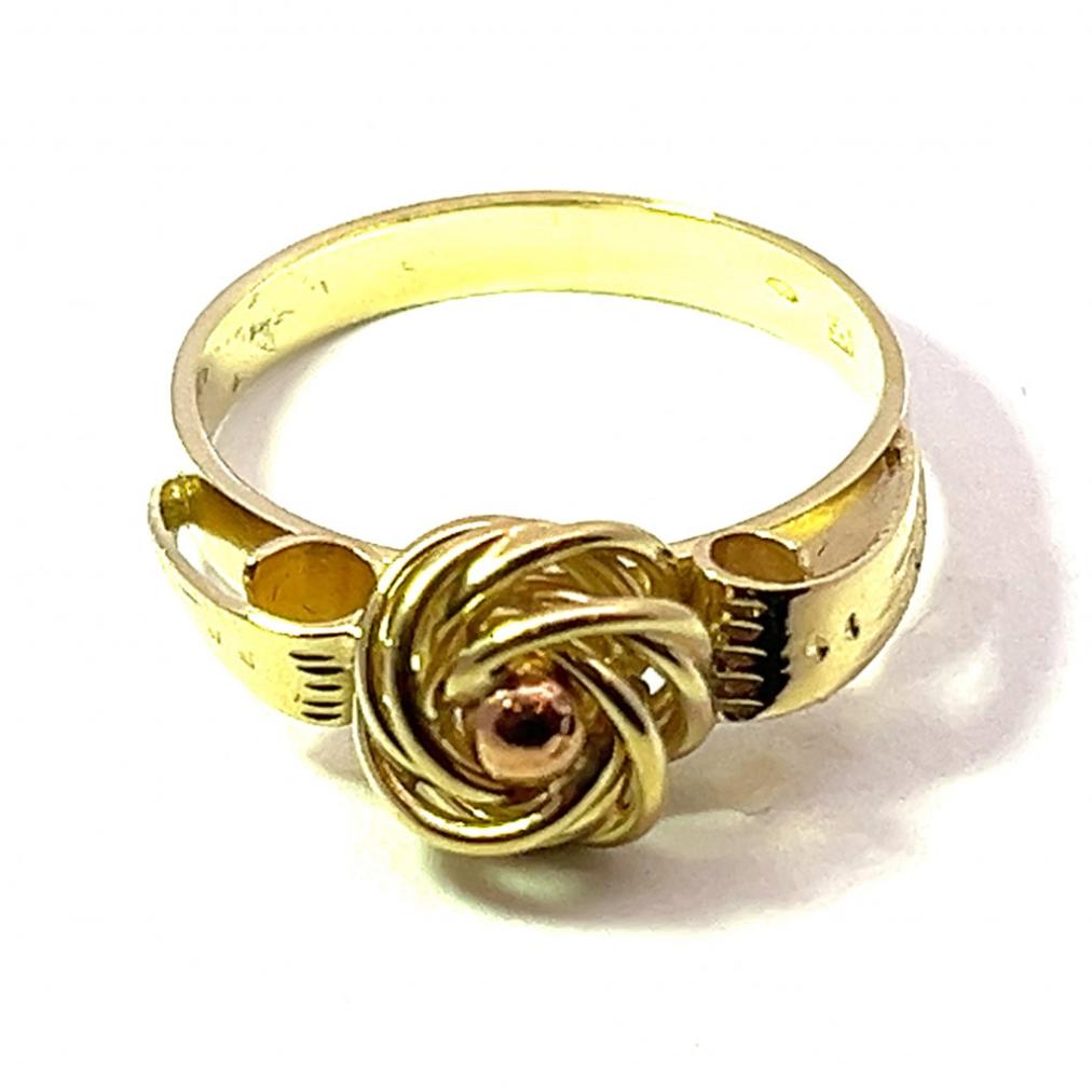 Zajímavě provedený zlatý prsten o ryzosti 585/1000 s puncem čejka ze žlutého zlata s kuličkou z růžového zlata. Váha 3,22 g, velikost 53. V nejširším bodě měří 8 mm.