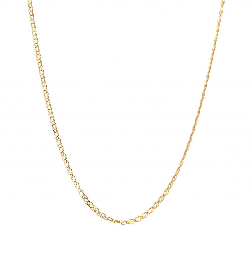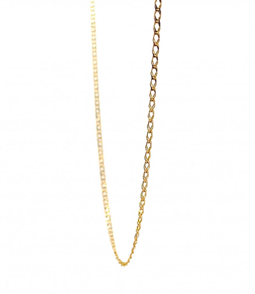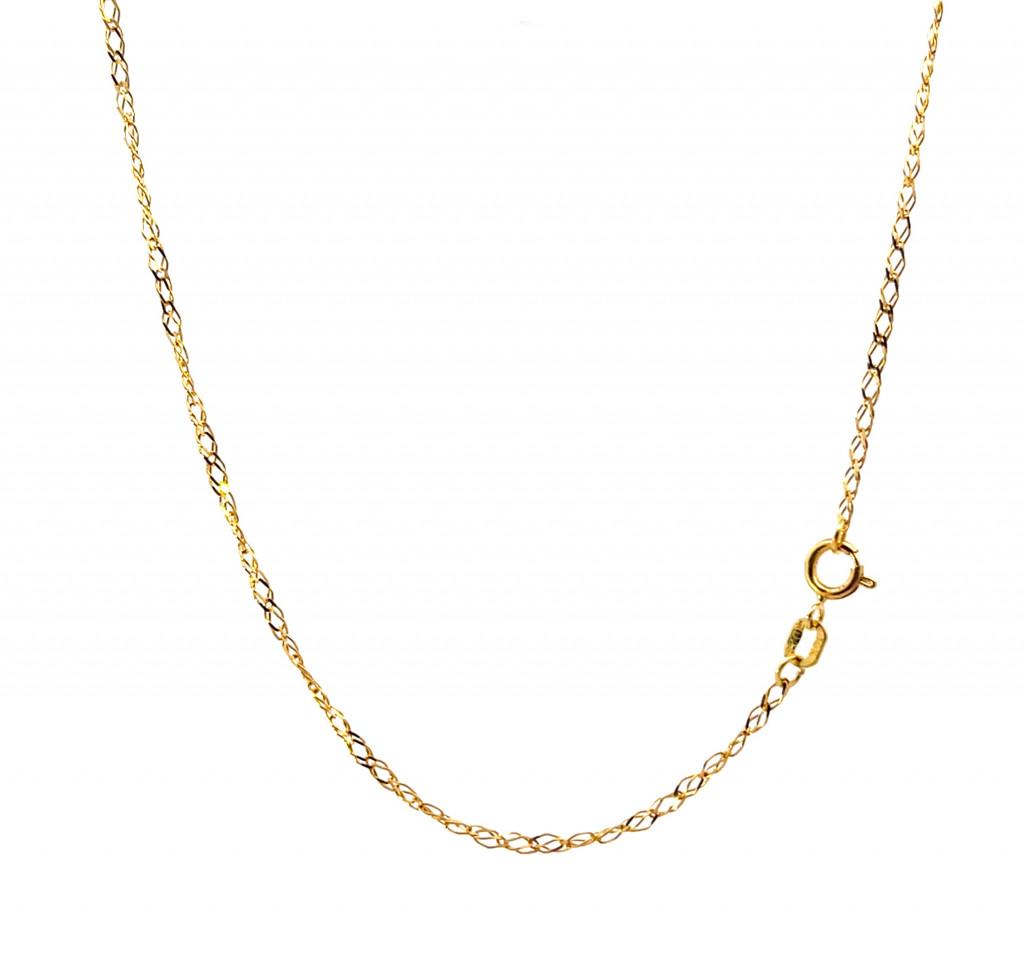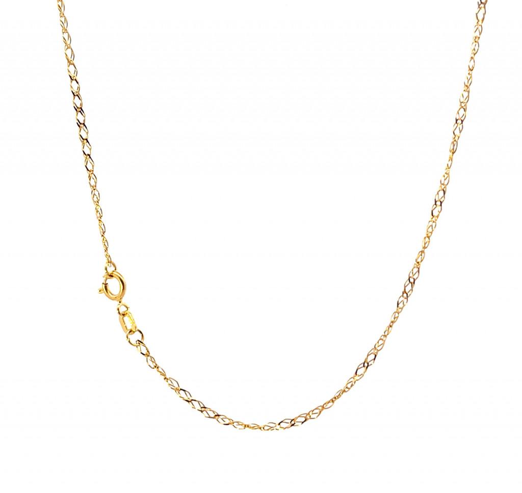 Zlatý řetízek o ryzosti 585/1000, punc labuť. Váha 1,57 g, délka 49,5 cm, v nejširším bodě 1,5 mm.