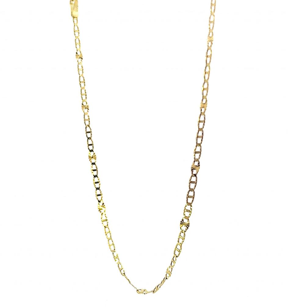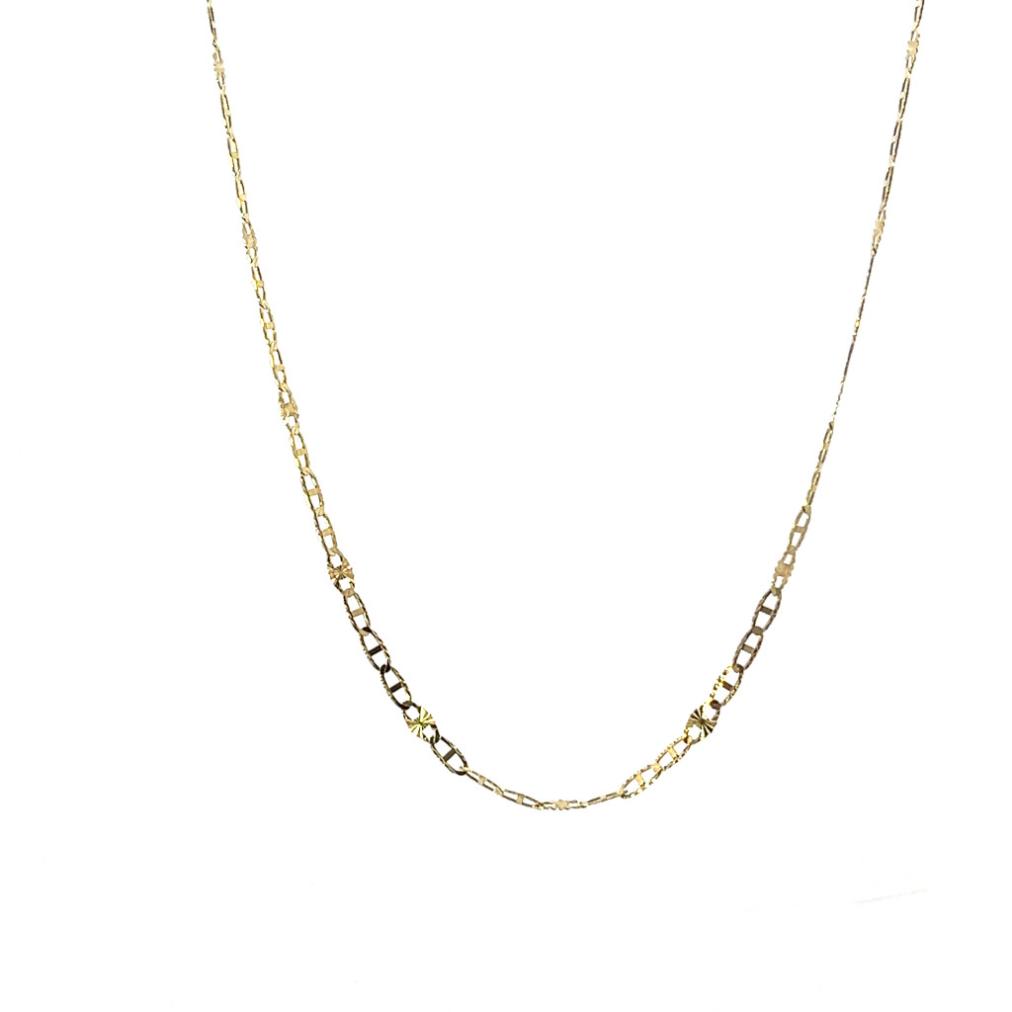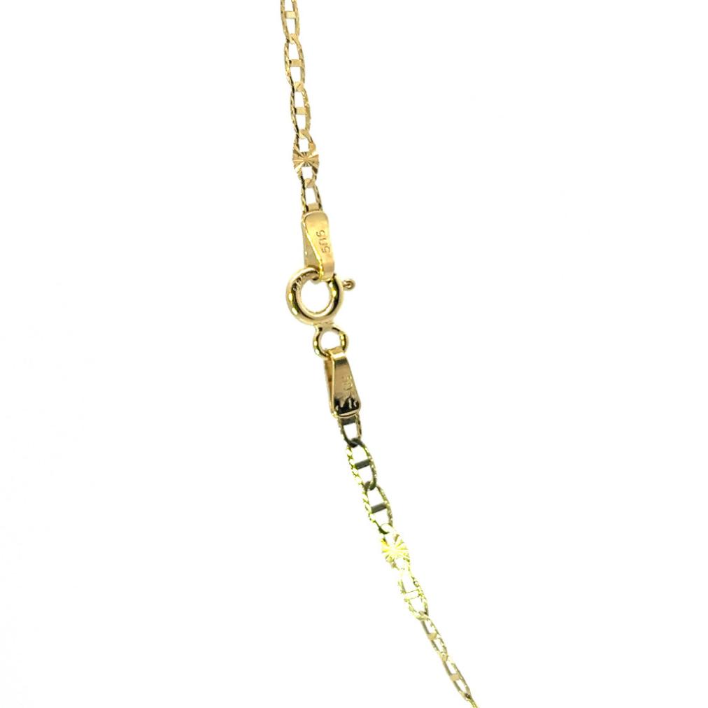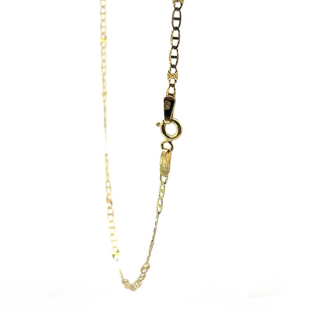 Zlatý řetízek o ryzosti 585/1000 s puncem labuť. Váha 1,72 g, délka 45 cm, šířka větších oček 2 mm, šířka menších oček je 1 mm.