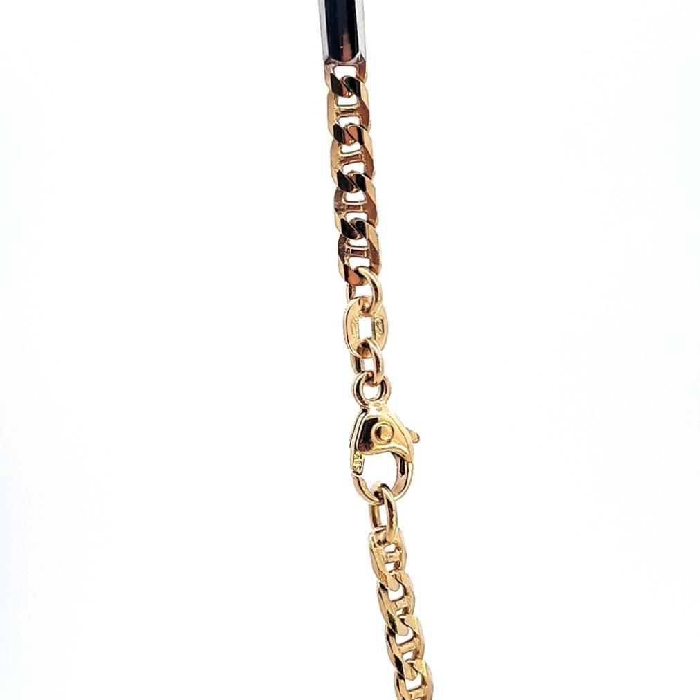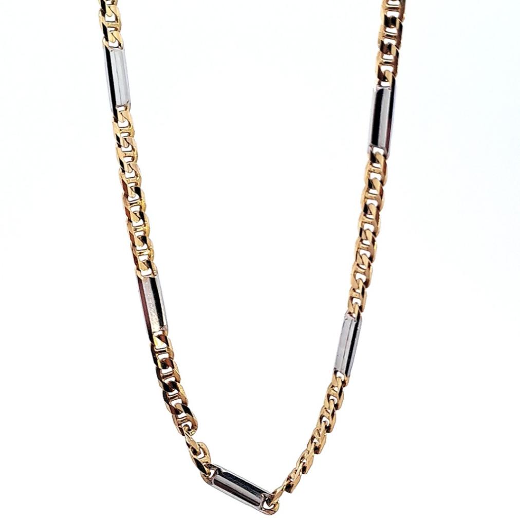 Zlatý řetízek, kombinace žluté a bílé zlato. Ryzost 585/1000, punc labuť. Váha 10,75 g, délka 45 cm, šířka 3 mm.
