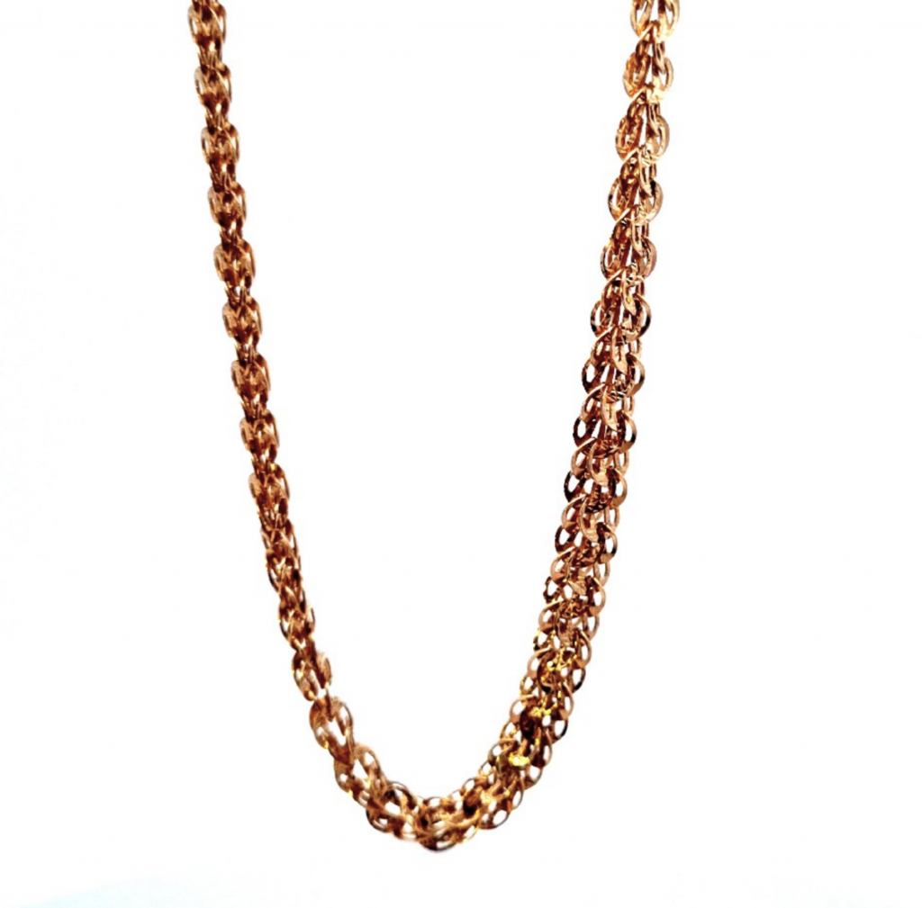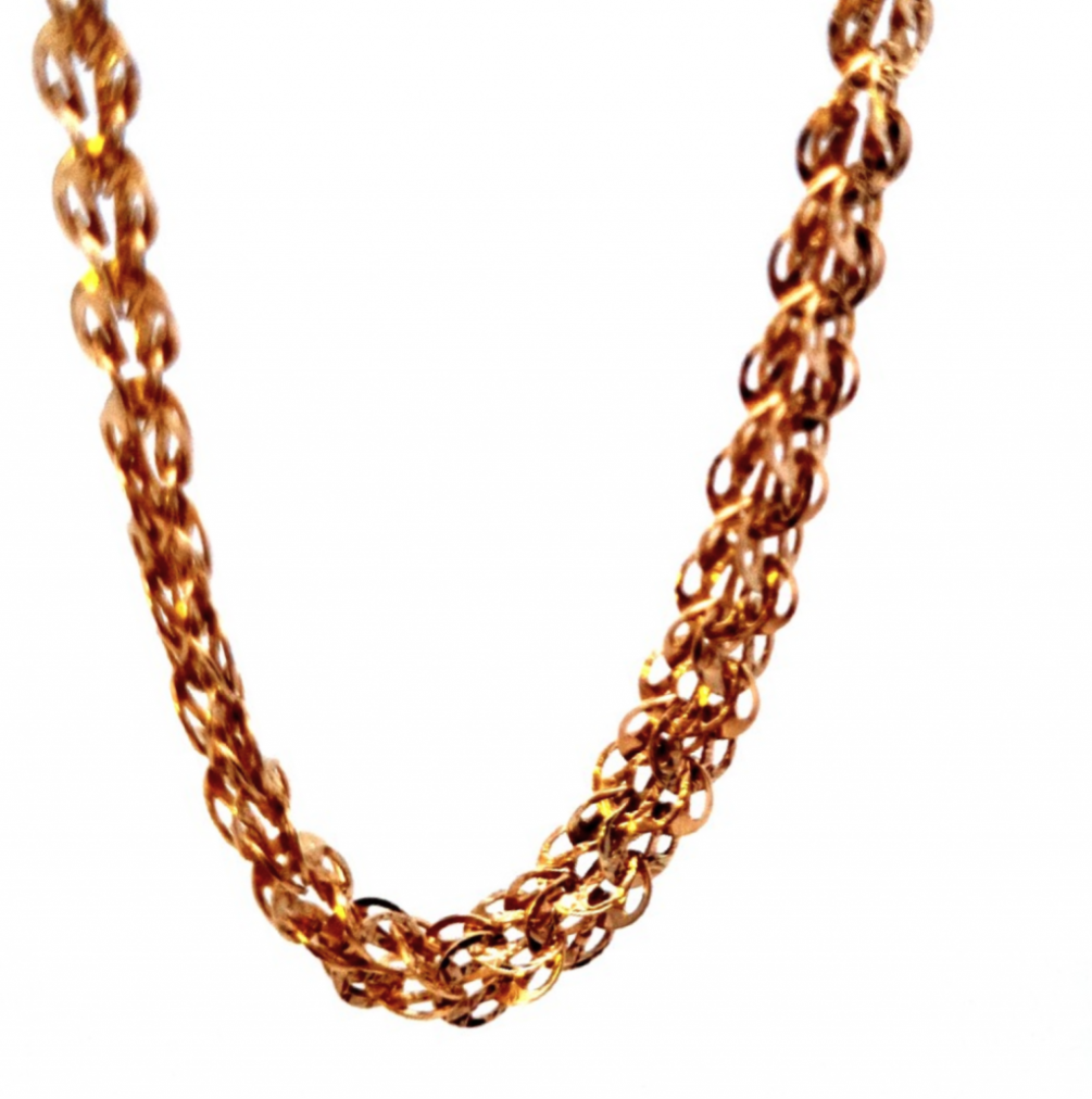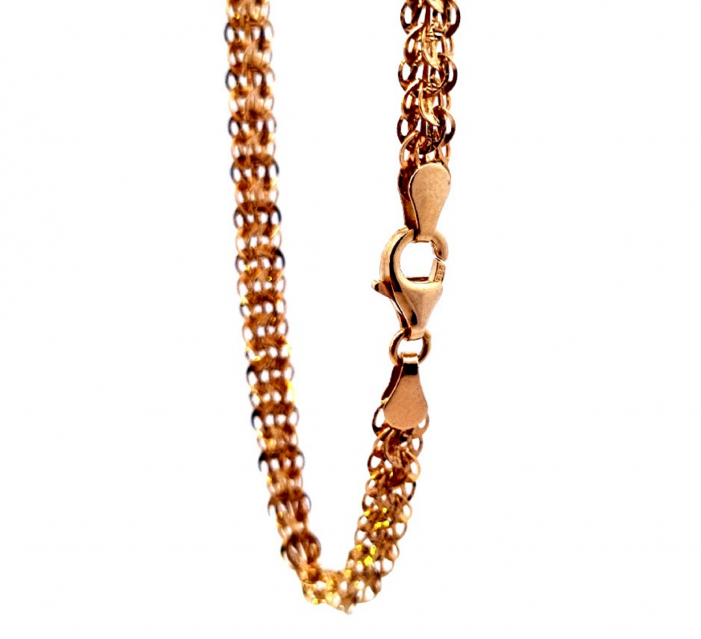 Zlatý řetízek o ryzosti 585/1000, punc labuť. Váha 11,05 g, délka 44,5 cm, v nejširším bodě 5 mm.