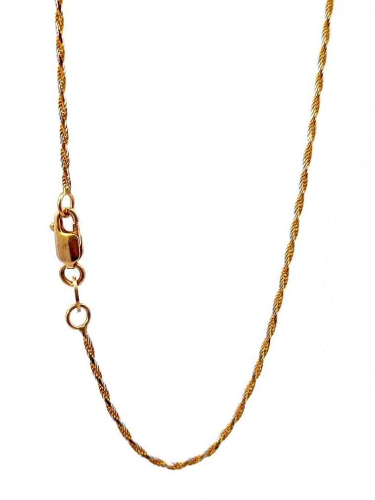 Kroucený řetízek z kombinace žlutého a bílého zlata o ryzosti 585/1000 s puncem labutě. Váha 3,38 g, délka 55 cm, šířka 1 mm.