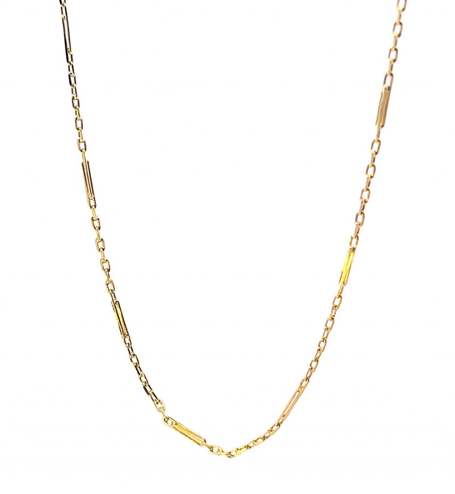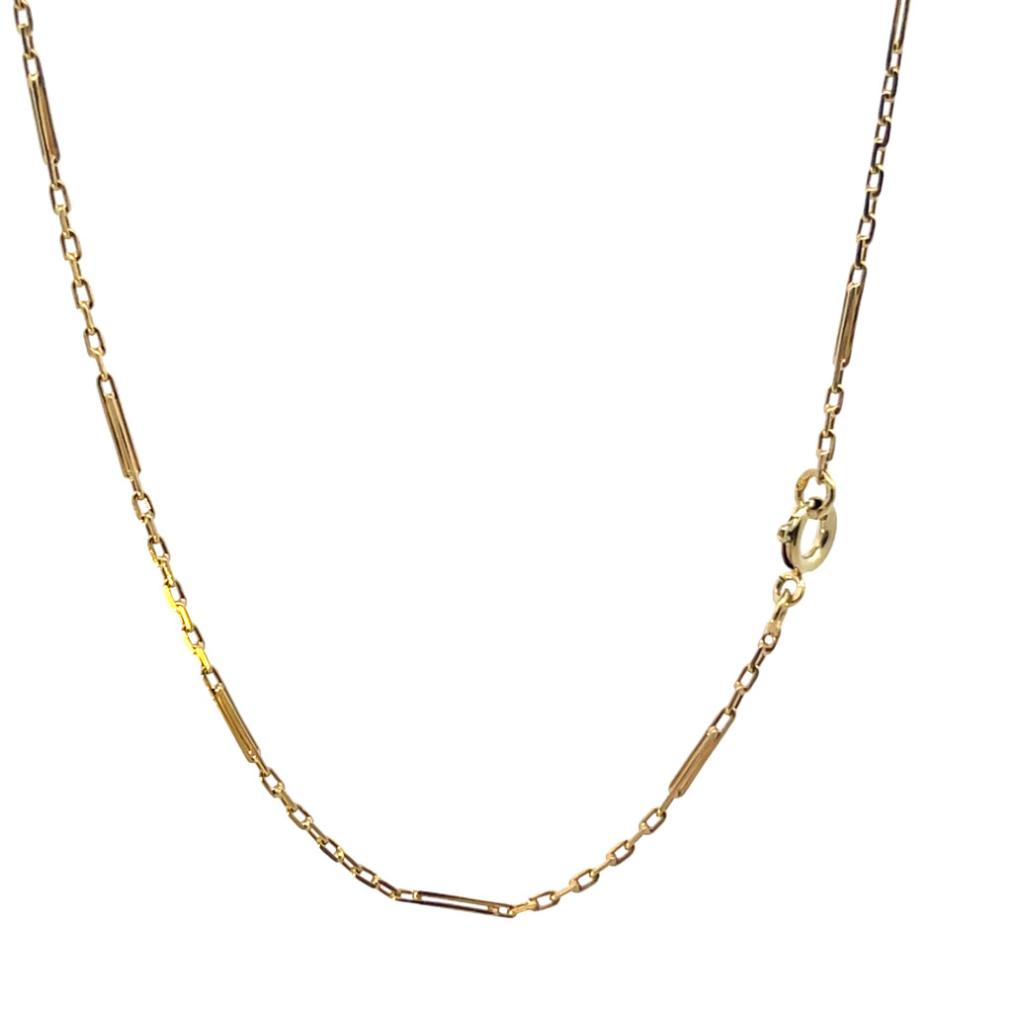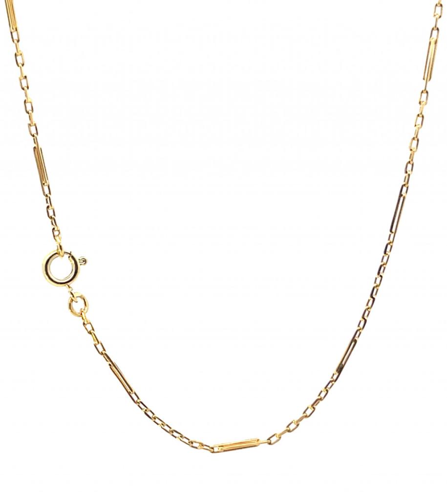 Zlatý řetízek s články o ryzosti 585/1000 s puncem čejka. Váha 3,74 g, délka 50 cm. Šířka 1 mm, délka článků je 1 cm.