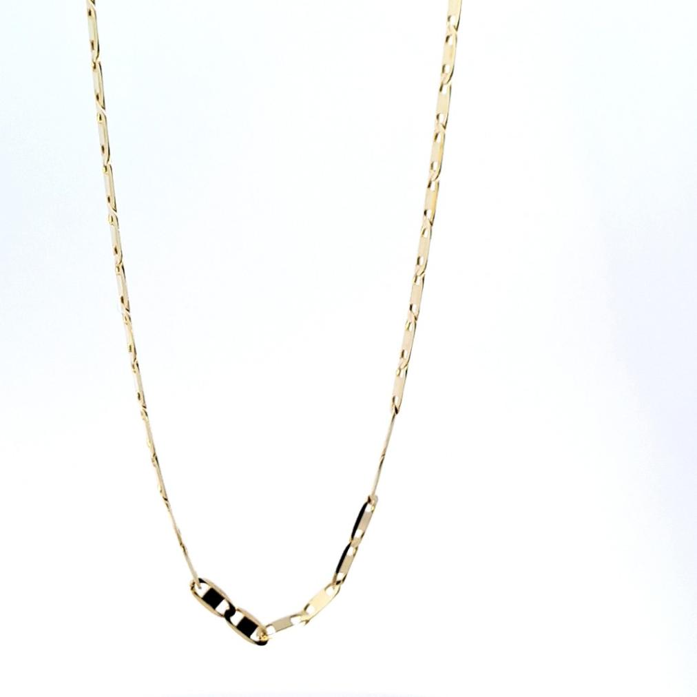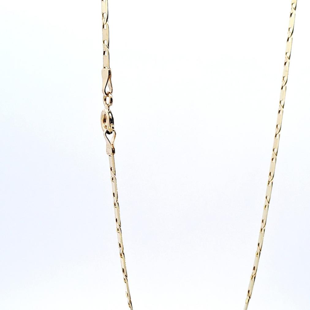 Zlatý řetízek o ryzosti 585/1000, punc labuť. Váha 4,66 g, délka 45,5 cm, šířka 2,5 mm.
