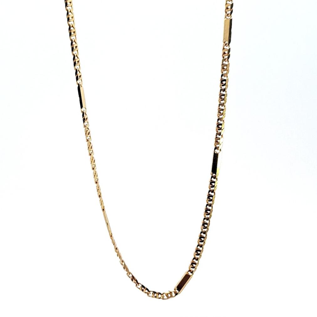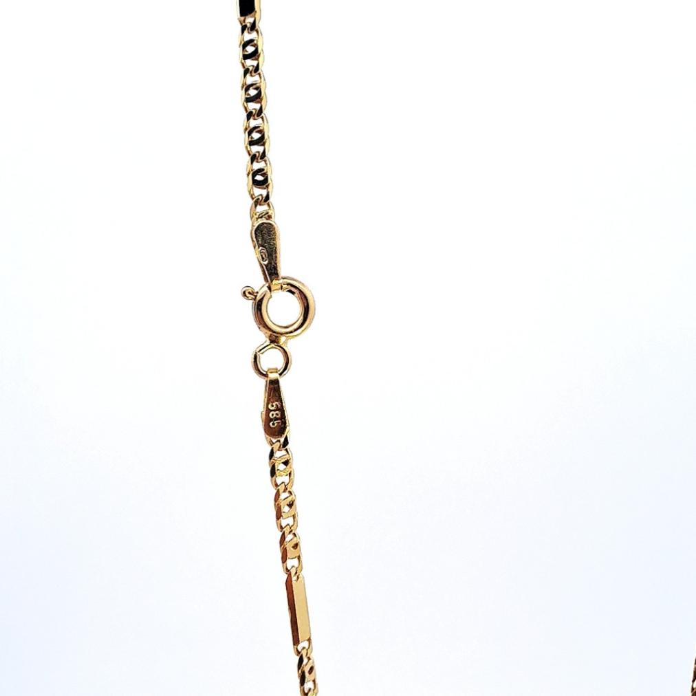 Zlatý řetízek o ryzosti 585/1000, punc labuť. Váha 4,7 g, délka 46 cm, šířka 2 mm.