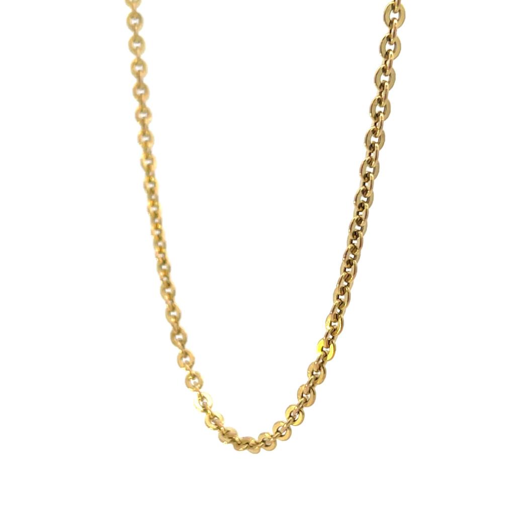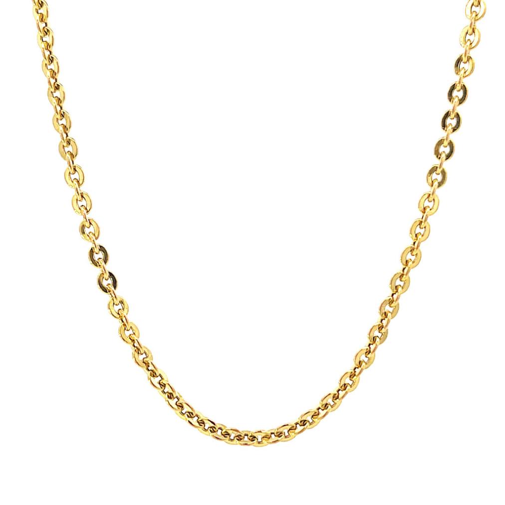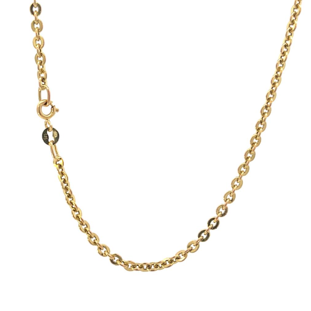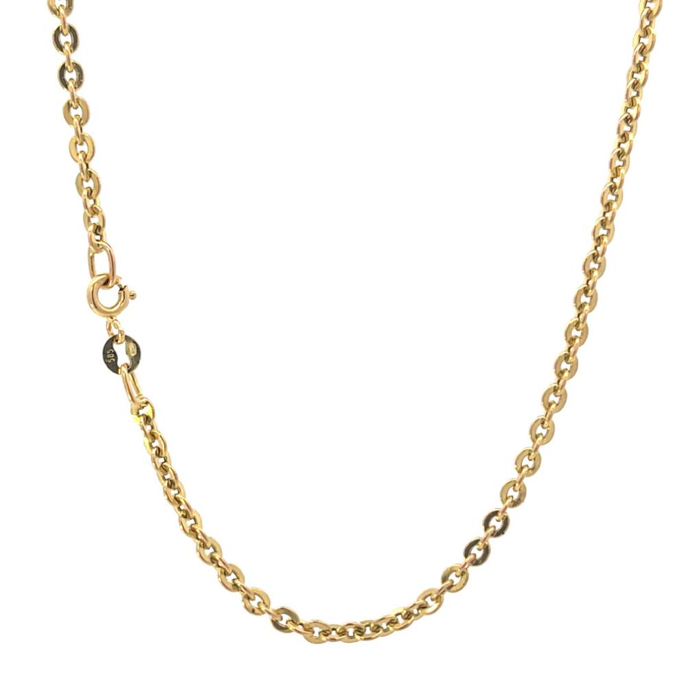 Zlatý řetízek s širokými očky o ryzosti 585/1000 s puncem labuť. Váha 5,32 g, délka 57 cm, šířka oček jsou 3 mm.