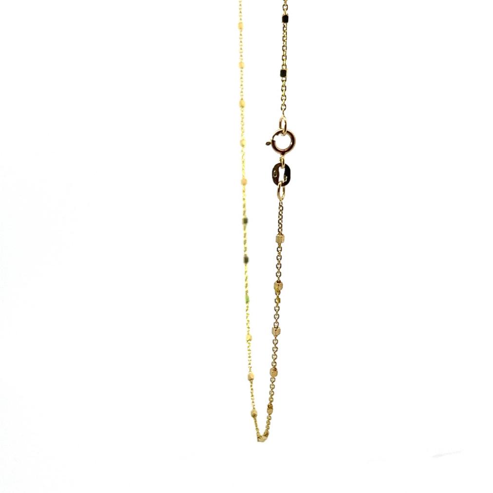 Originální zlatý řetízek o ryzosti 585/1000 s puncem labuť, který je zdobený malinkými kostkami. Váha 2,28 g, délka 45 cm, šířka oček 0,5 mm, šířka kostek 1 x 1 mm.