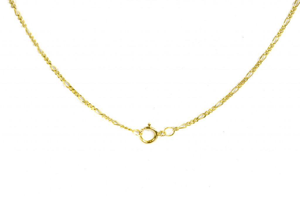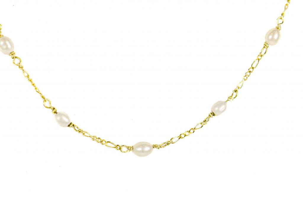 Zlatý řetízek o ryzosti 585/1000, punc labuť. Váha 3,06 g, délka 45 cm, šířka řetízku 1,5 mm, rozměr perliček 3 x 4 mm.