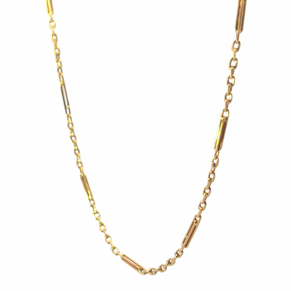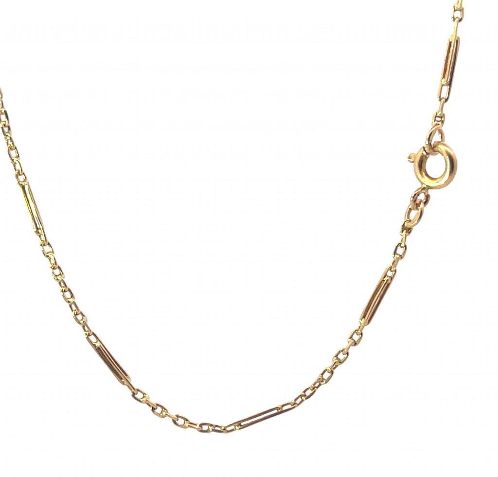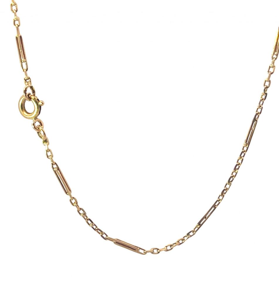 Zlatý řetízek s články z červeného zlata o ryzosti 585/1000 s puncem čejka. Váha 4,05 g, délka 51 cm, šířka oček 1 mm, délka článků je 10 mm.