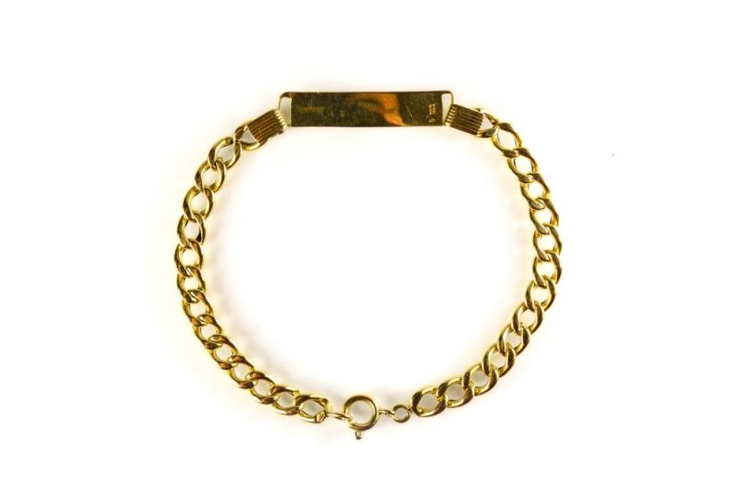 Zlatý náramek o ryzosti 585/1000, punc - osvědčení z puncovního úřadu. Váha 7,52 g, délka 24 cm, šířka 6,5 mm.