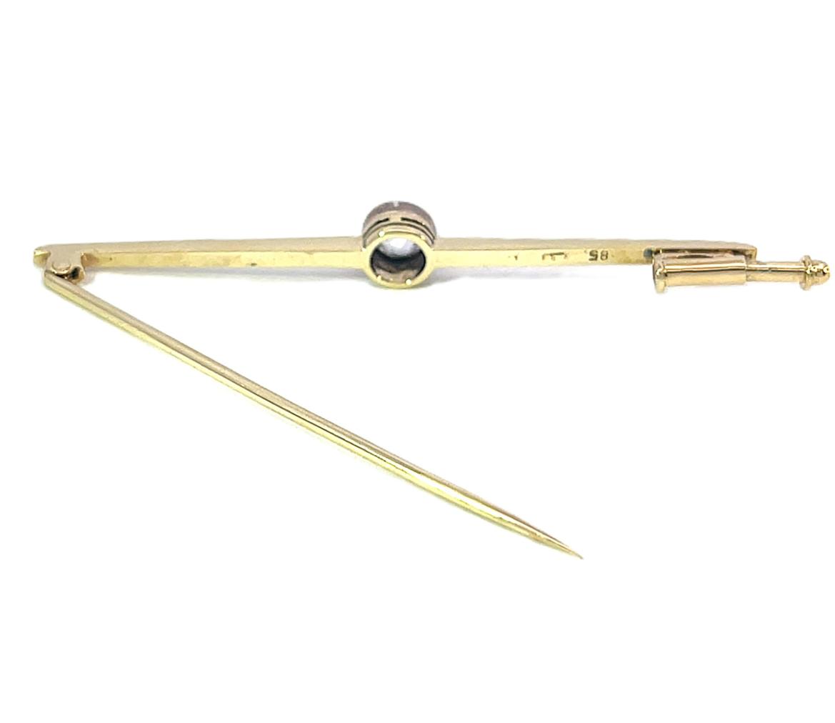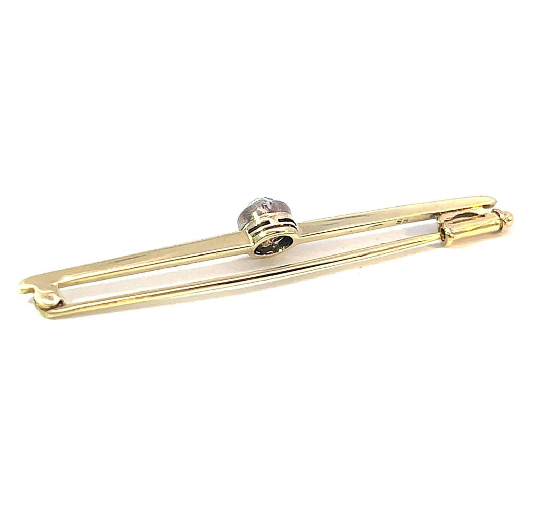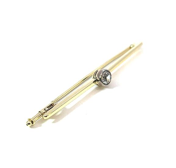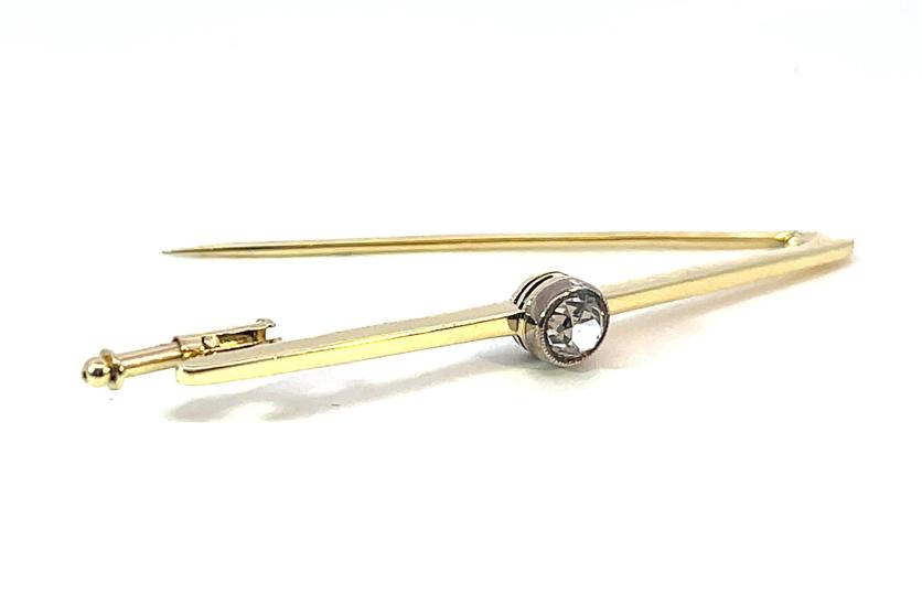 Brož z kombinace žlutého a bílého zlata o ryzosti 585/1000, punc labuť. Váha 2,48 g, délka 48 mm, v nejširším bodě 5 mm.