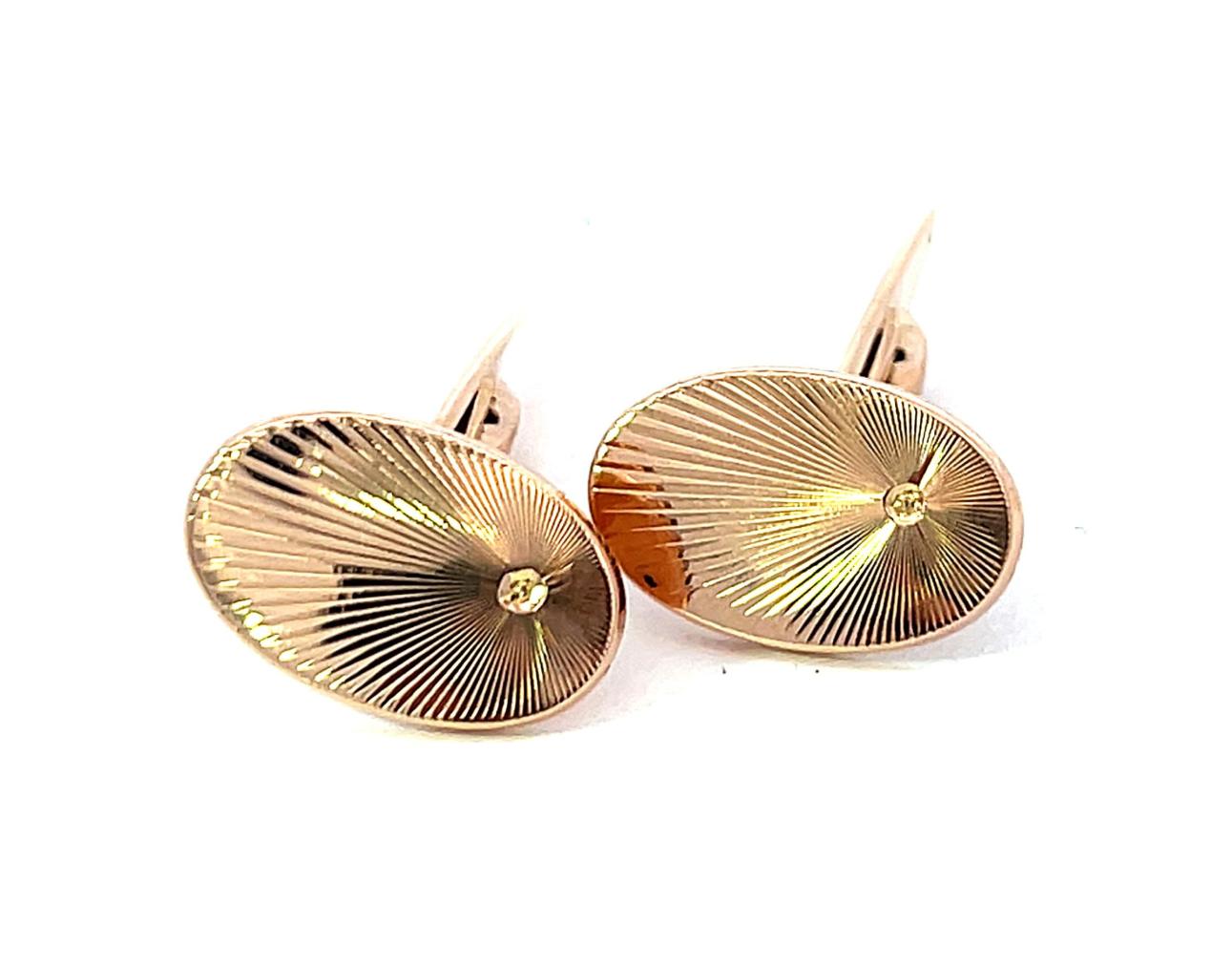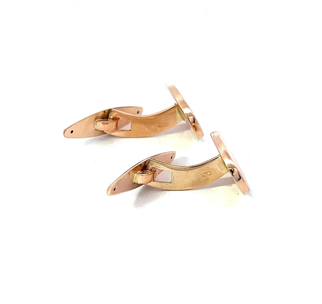 Manžetové kniflíky z růžového zlata o ryzosti 585/1000, punc AW(Z-29). Váha 3,85 g, rozměr 10 x 16 mm.