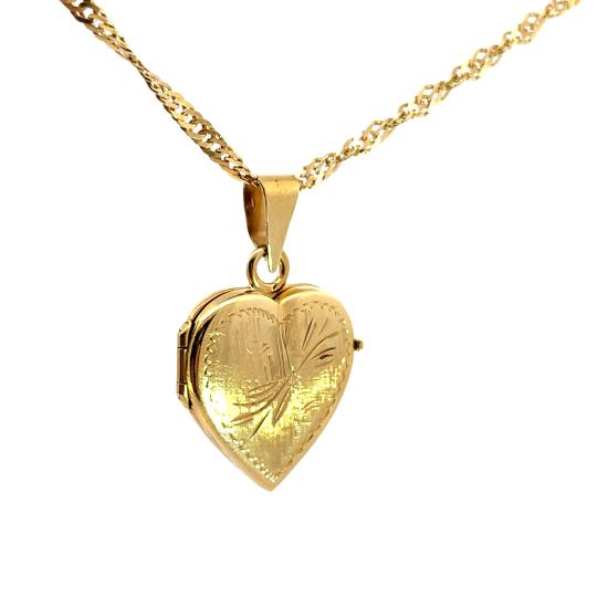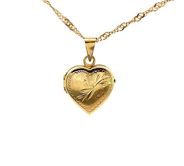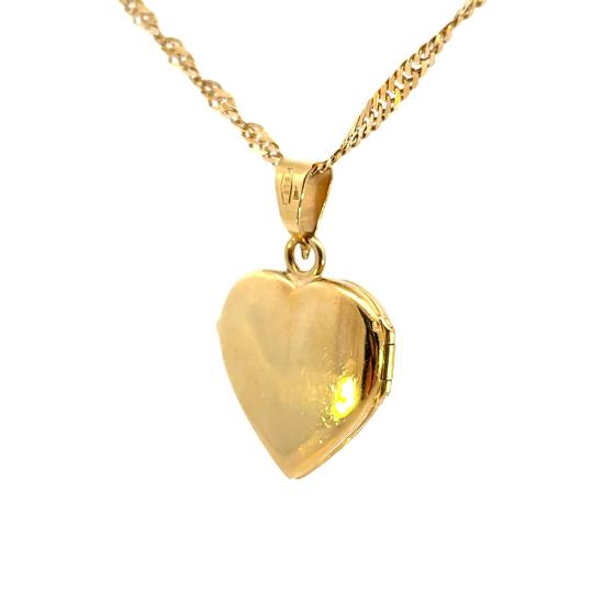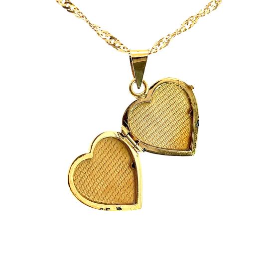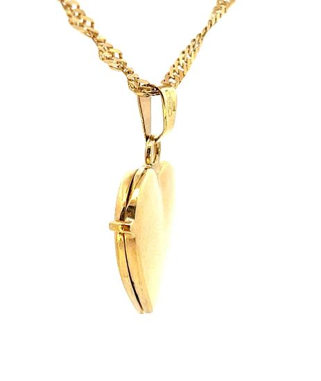 Zlatý přívěs - medailon ve tvaru srdce. Ryzost 585/1000, punc labuť. Váha je 4,03 g. Celková výška i s očkem je 29 mm. V nejširším bodě měří 20 mm.