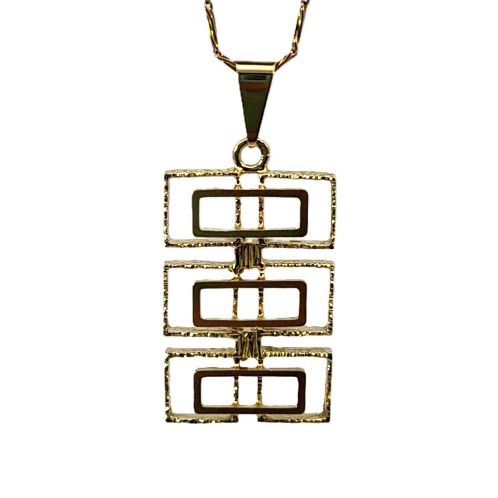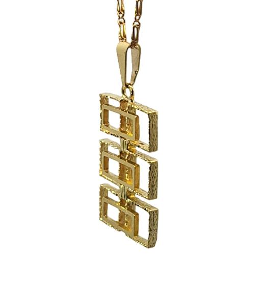 Starožitný zlatý přívěs o ryzosti 585/1000, punc lyra. Váha 4,26 g, výška včetně očka 38 mm, v nejširším bodě 17,5 mm.