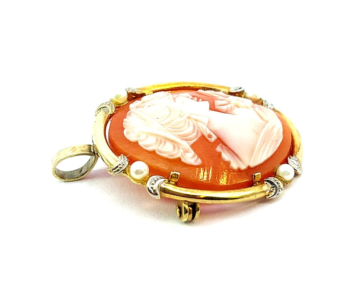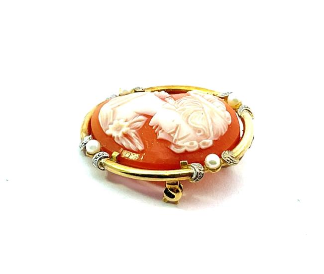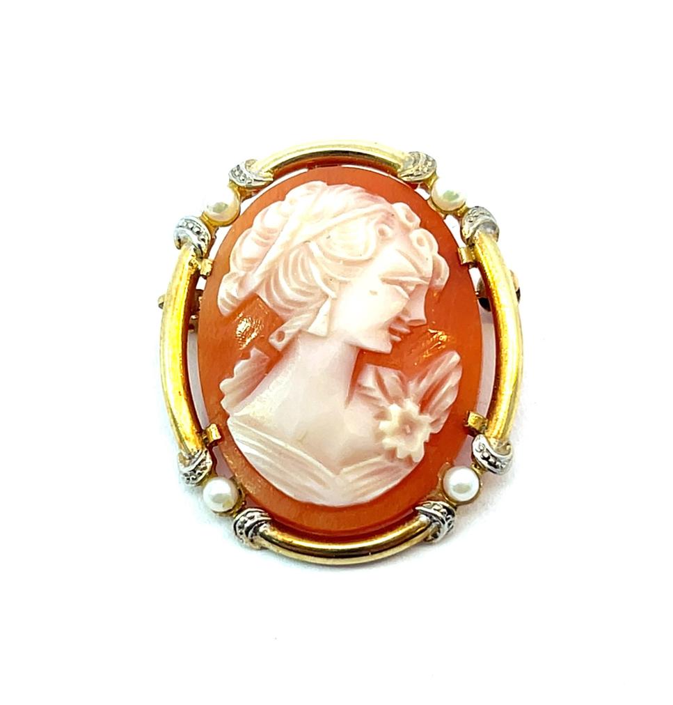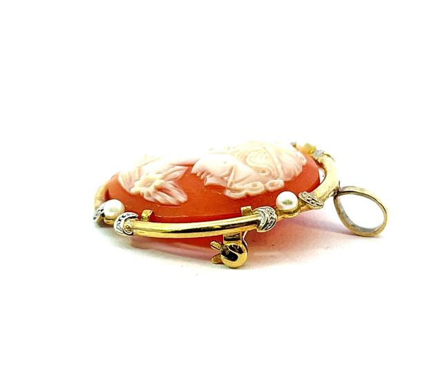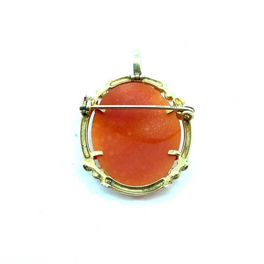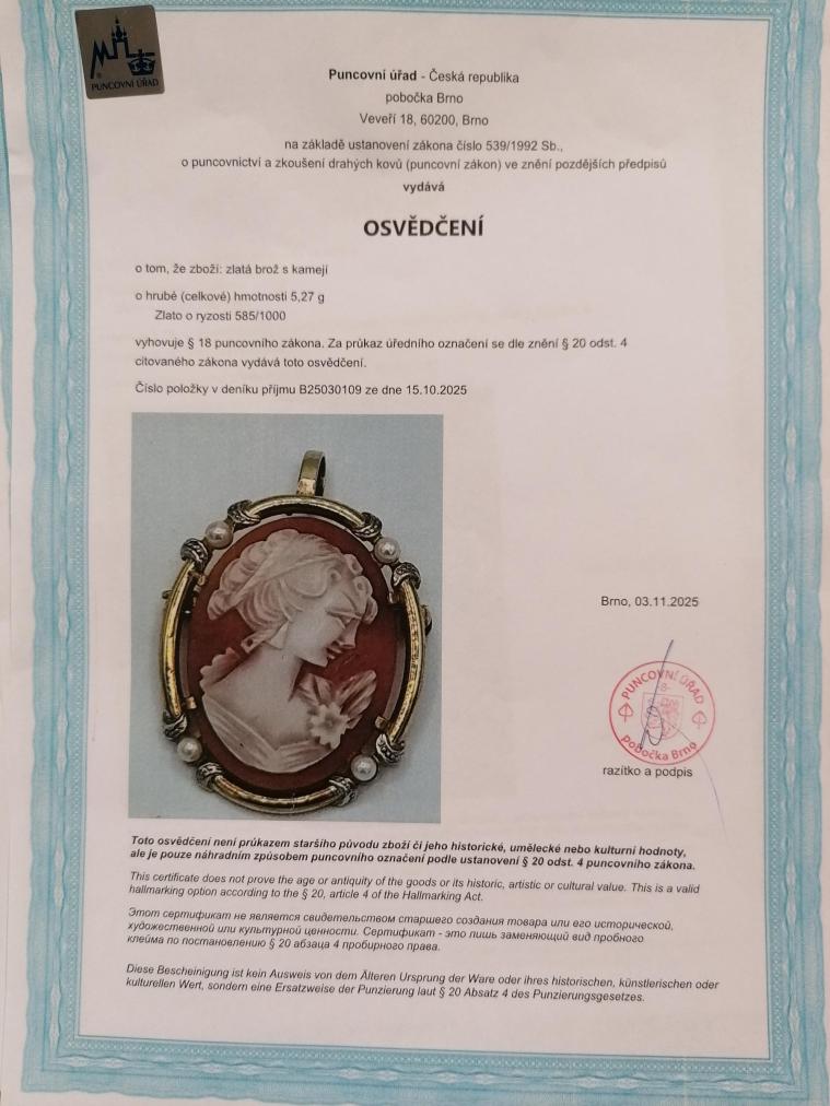 Zlatá brož, kterou je možné nosit i jako přívěs o ryzosti 585/1000, osvědčení z PÚ. Váha 5,27 g, výška včetně očka 36 mm, v nejširším bodě 24 mm.