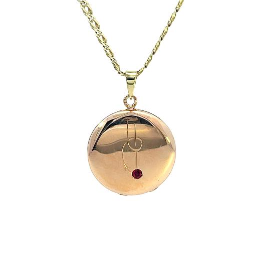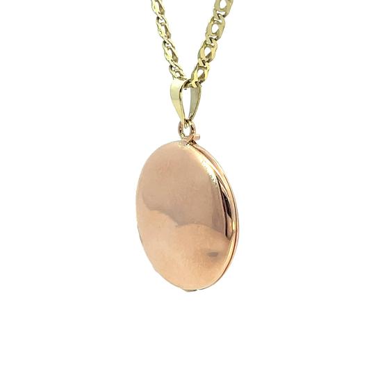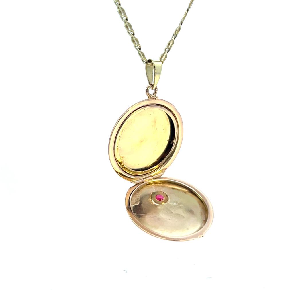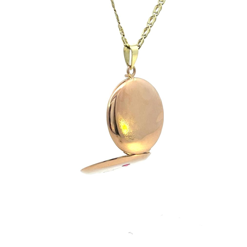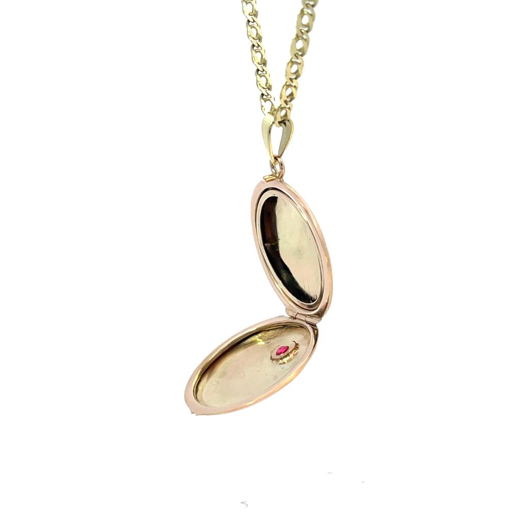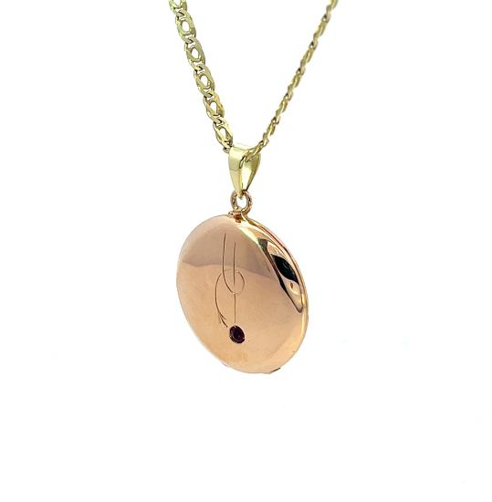 Medailon z kombinace žlutého (očko přívěsu) a růžového zlata o ryzosti 585/1000, punc labuť. Váha 3,34 g, výška včetně očka 33 mm, v nejširším bodě 23 mm. Kámen je syntetický. Z přední strany je ve zlatě velmi drobné promáčknutí, ze zadní strany přívěsu je více míst - viz foto. Řetízek není součástí nabídky.