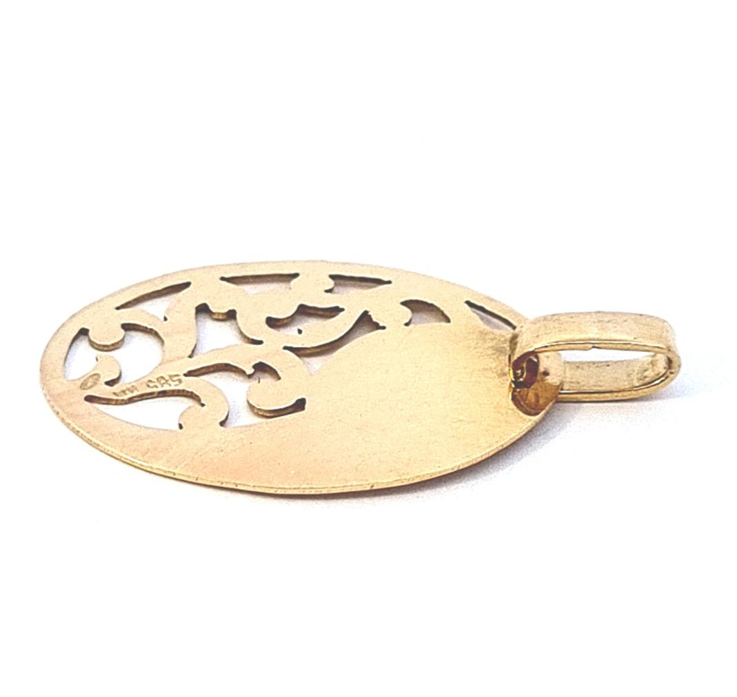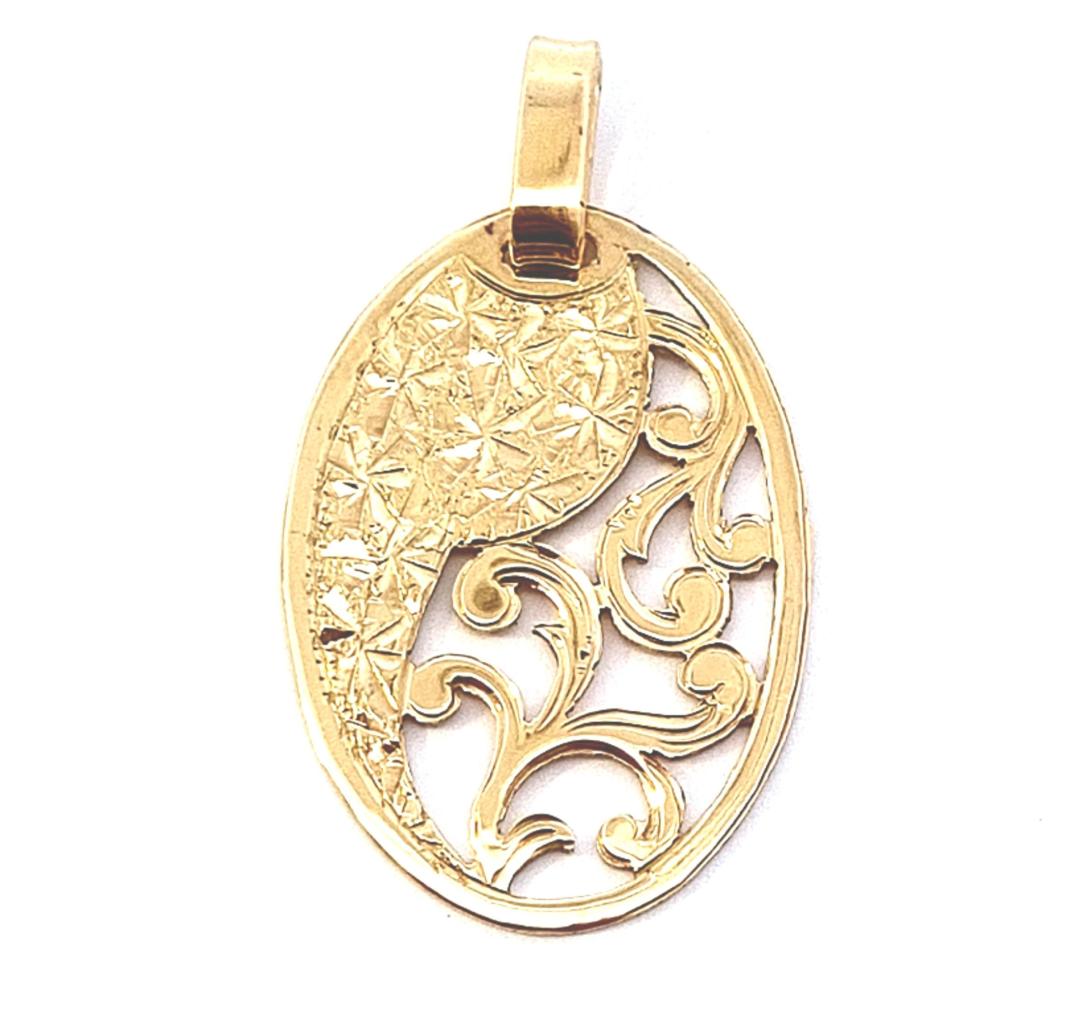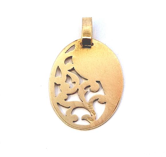 Zlatý přívěs o ryzosti 585/1000, punc čejka. Váha 2,31 g, výška včetně očka 33 mm, v nejširším bodě 18,5 mm.