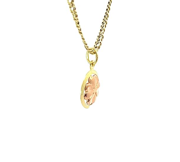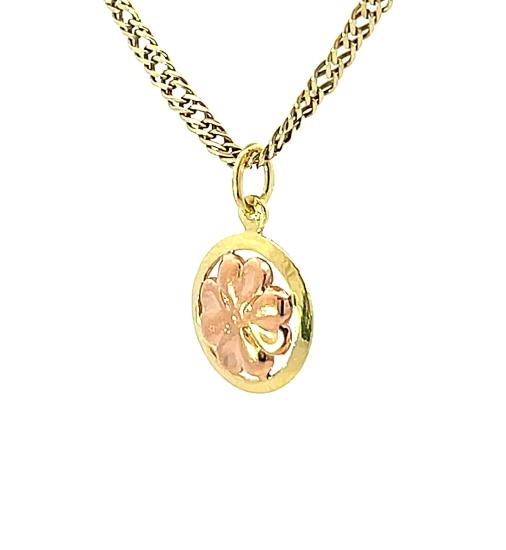 Přívěs z kombinace žlutého a růžového zlata o ryzosti 585/1000, punc čejka. Váha 0,61 g, výška včetně očka 18,5 mm, průměr přívěsu 12 mm. Řetízek není součástí nabídky.