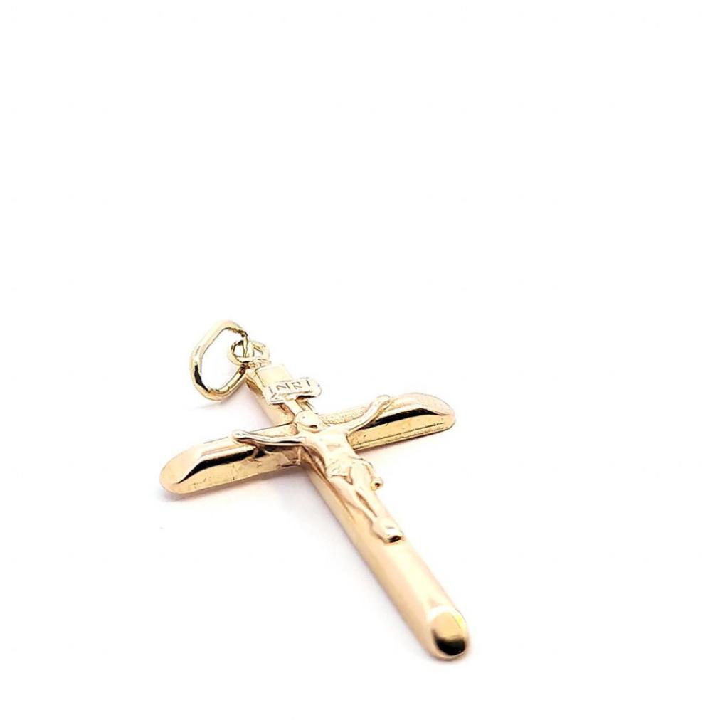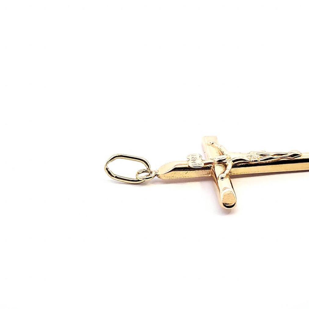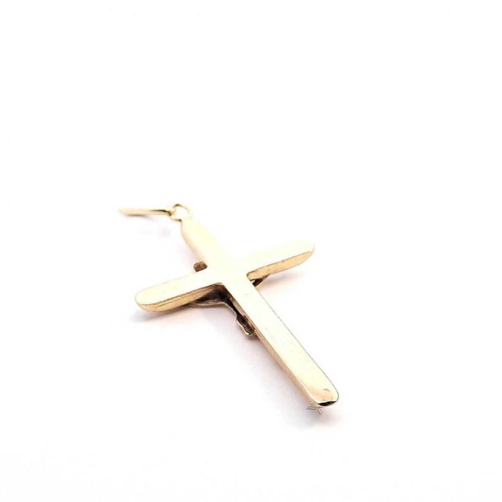 Zlatý přívěšek kříž s Ježíšem o ryzosti 585/1000 s puncem labuť. Váha 1,01 g. Celková délka i s očkem je 35 mm, šířka je 28 mm. Očko je prošoupané.