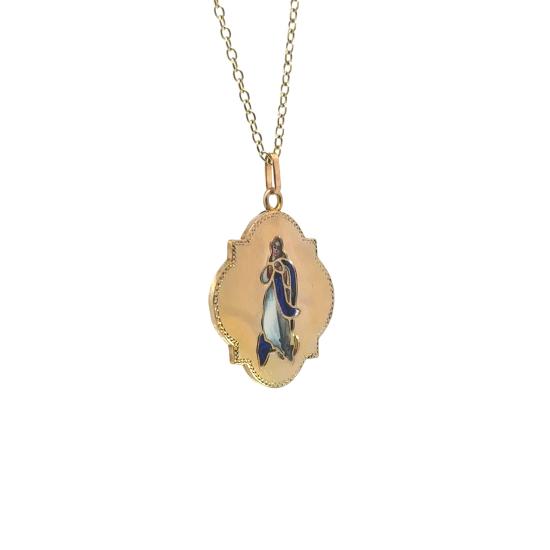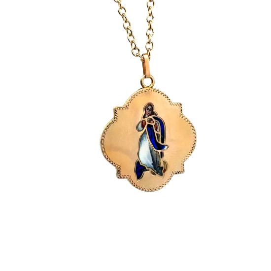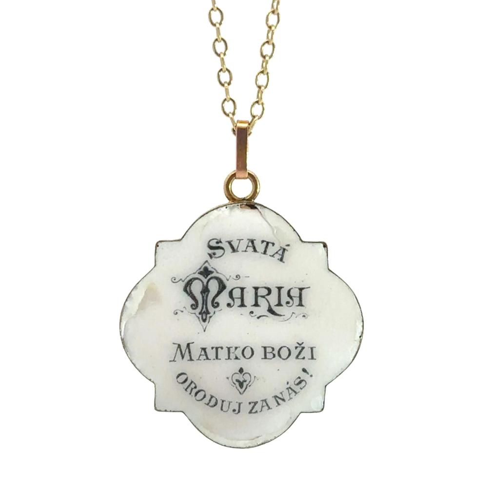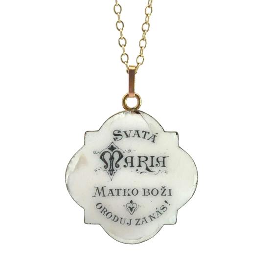 Zlatý přívěs o ryzosti 585/1000, punc labuť. Váha 4,05 g, výška včetně očka 32 mm, v nejširším bodě 24 mm. Porcelán na zadní straně má pár oťuků, viz foto.