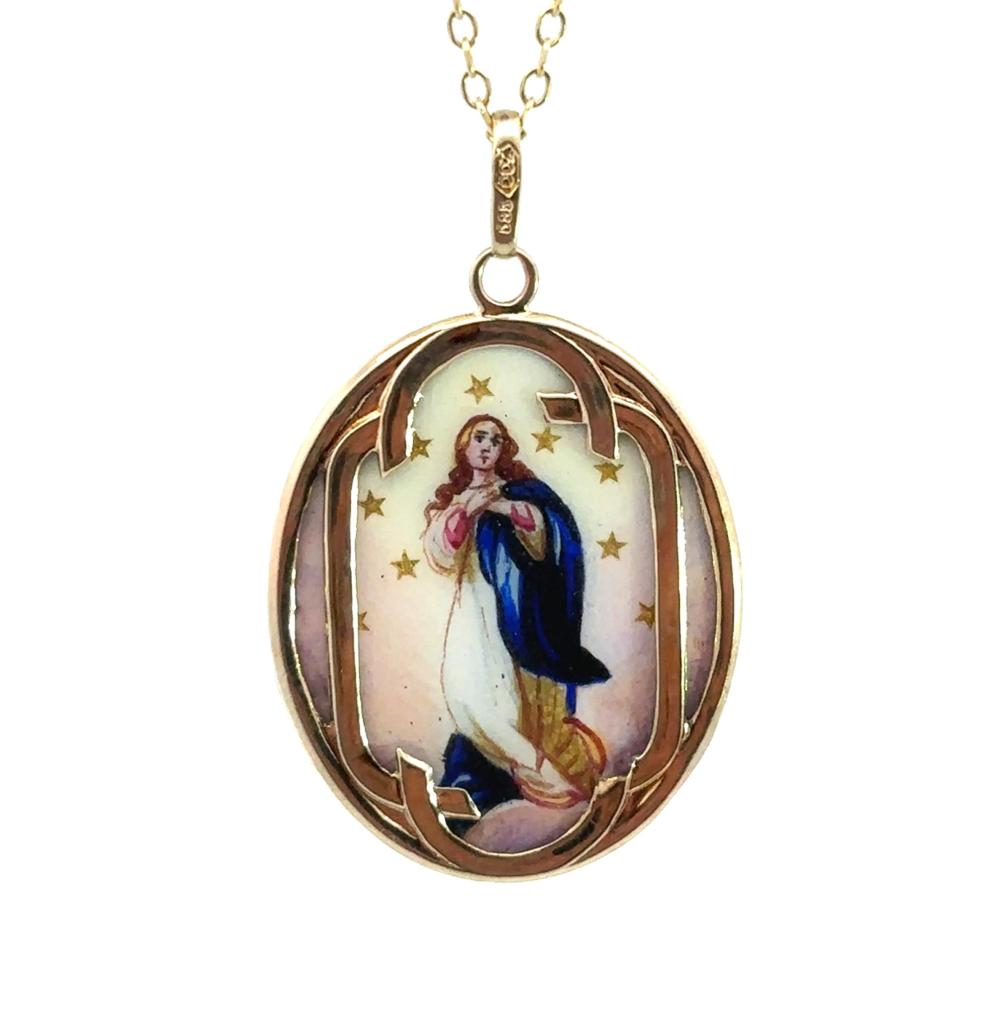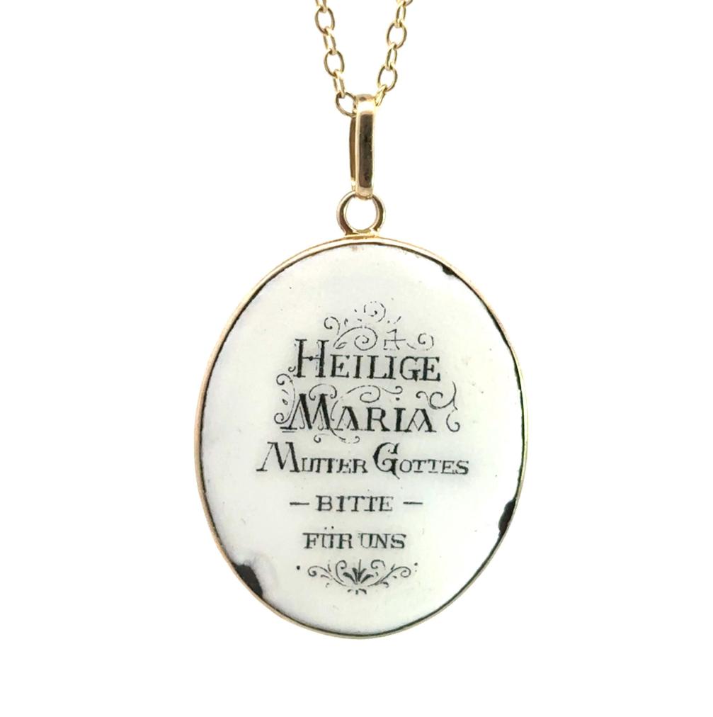 Zlatý přívěs o ryzosti 585/1000, punc labuť. Váha 5,67 g, výška včetně očka 38 mm, v nejširším bodě 23 mm. Porcelán na zadní straně má 3 oťuky, viz foto.