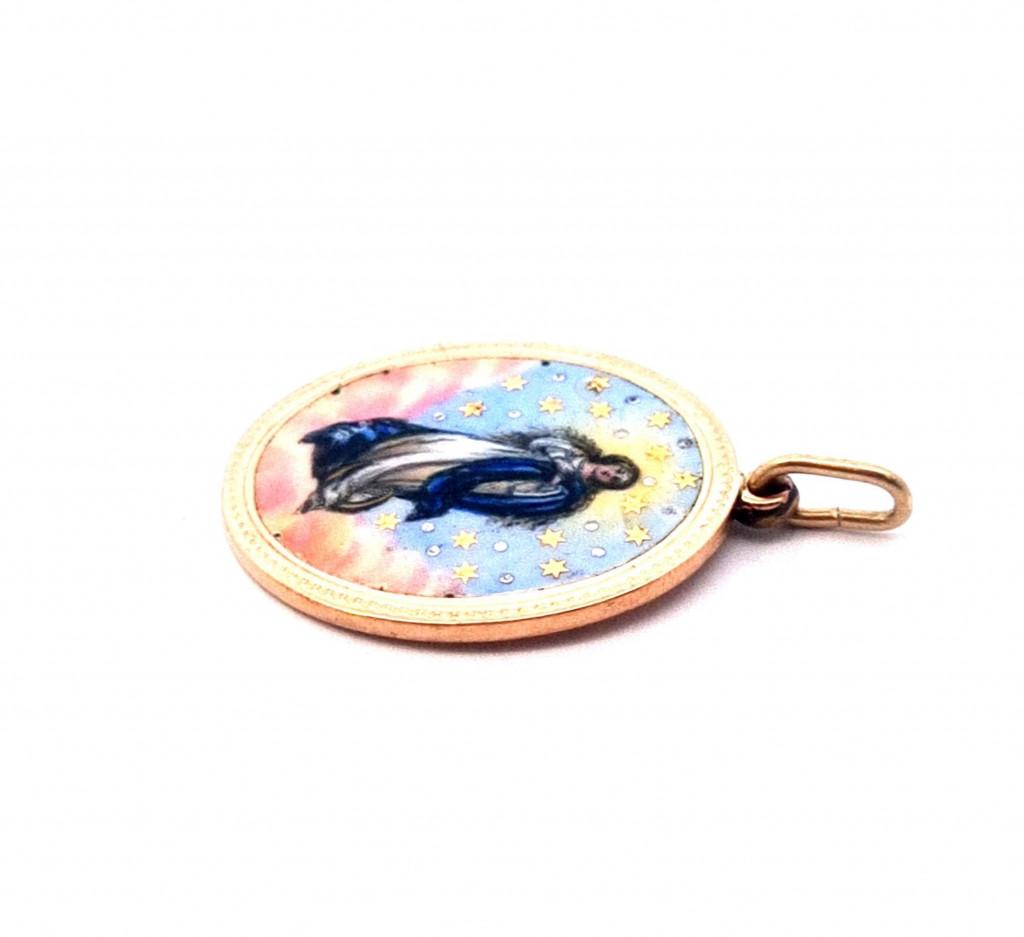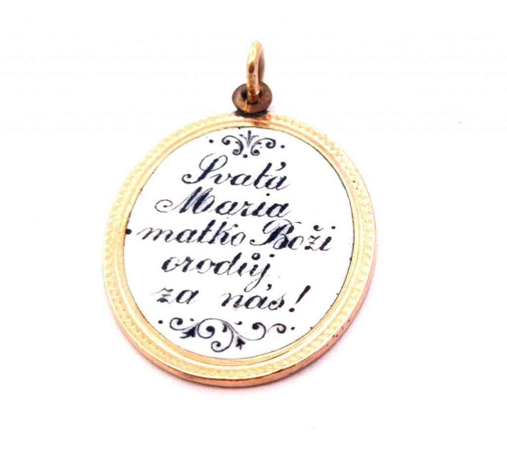 Přívěs z růžového zlata o ryzosti 585/1000, punc labuť. Váha 3,47 g, výška včetně očka 29 mm, v nejširším bodě 19 mm.