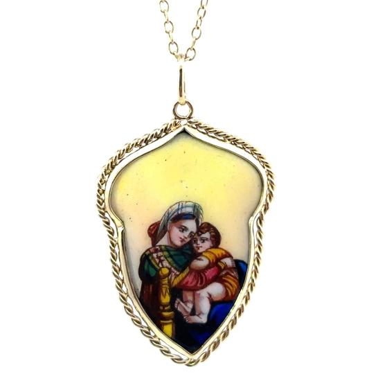 Zlatý přívěs o ryzosti 585/1000, punc labuť. Váha 7,06 g, výška včetně očka 45 mm, v nejširším bodě 26 mm.