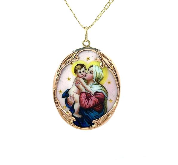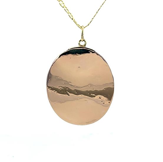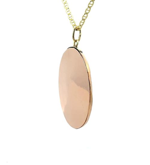 Přívěs z kombinace žlutého a růžového zlata o ryzosti 585/1000, punc labuť. Váha 8,18 g, výška včetně očka 42 mm, v nejširším bodě 28 mm. Zlato je na několika místech promáčknuté - viz foto.