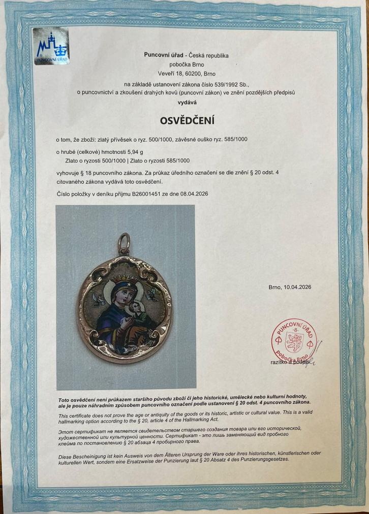 Přívěs z kombinace růžového zlata o ryzosti 500/1000 (přívěs) a zlata o ryzosti 585/1000 (závěsné očko), osvědčení z PÚ. Váha 5,94 g, výška včetně očka 38 mm, v nejširším bodě 25 mm. Zlato po obvodu má prohlubně a je lehce zoxidované - viz foto, jedná se o starožitný šperk, u závěsného očka jsou patrné stopy po opravě. Ve spodní části je ulomený kousek zlata - ozdobná část. Všechny vady zohledněny v ceně.