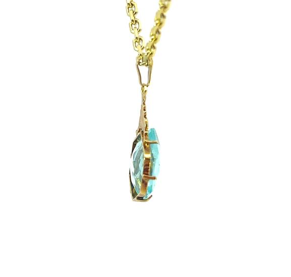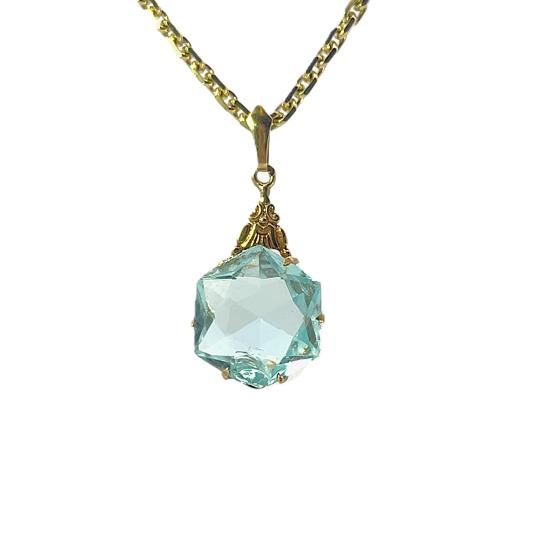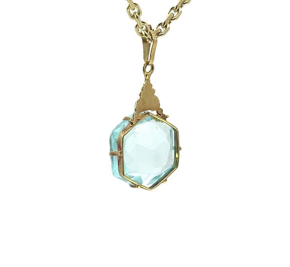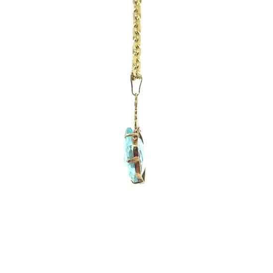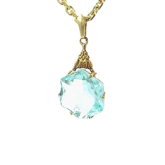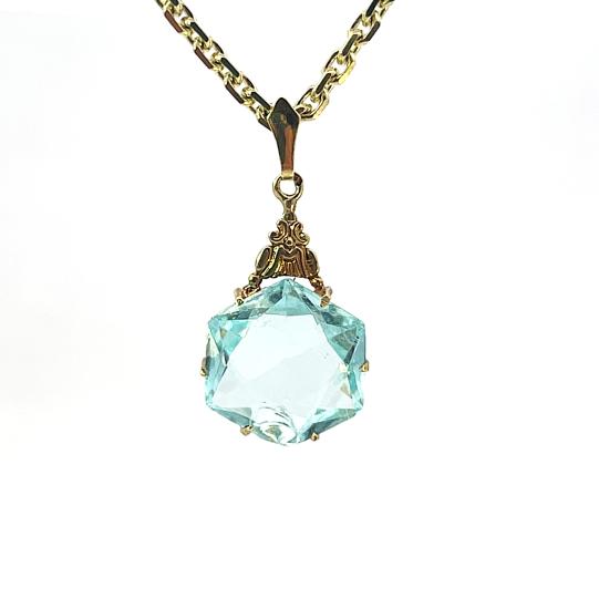 Zlatý přívěs o ryzosti 585/1000, punc lyra. Váha 1,38 g, výška včetně očka 23 mm, v nejširším bodě 12 mm. Kámen je syntetický a ze zadní strany je kousek uražený. Řetízek není součástí nabídky.