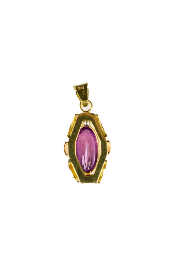 Zlatý přívěs s ametystem. Ryzost 585/1000, punc labuť. Váha 2,5 g, výška i s očkem 27mm, šířka 11 mm. Kámen je syntetický.