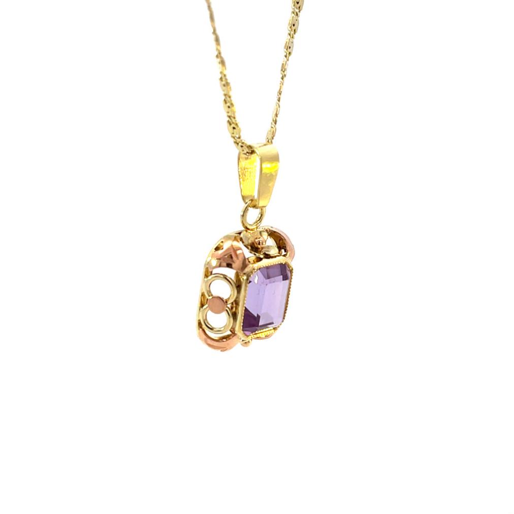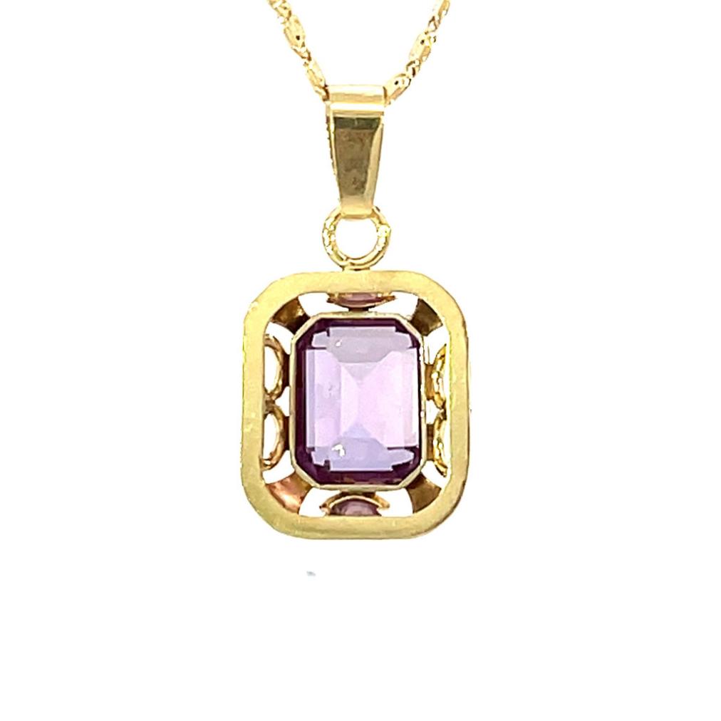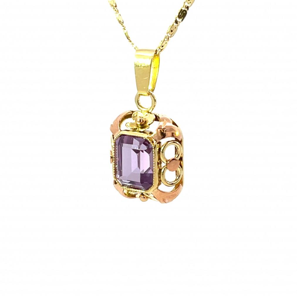 Přívěs z kombinace žlutého a růžového zlata o ryzosti 585/1000, punc čejka. Váha 2,29 g, výška včetně očka 24 mm, v nejširším bode 12 mm, rozměr kamene 9 x 7,5 mm. Kámen je syntetický. Řetízek není součástí nabídky.