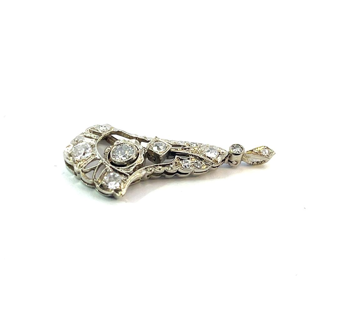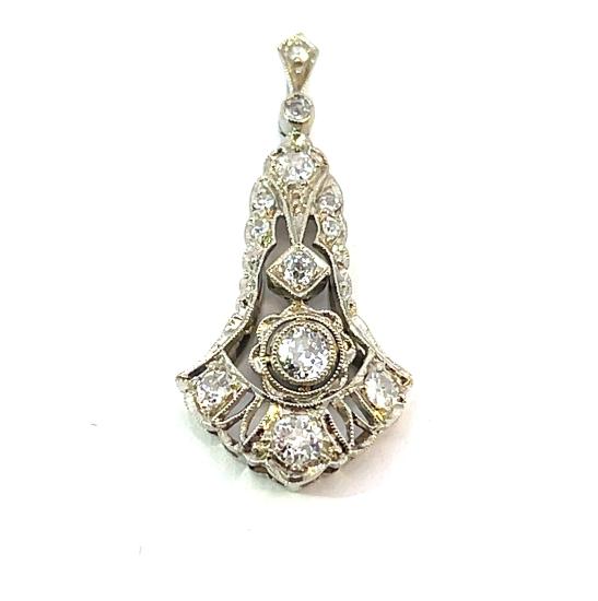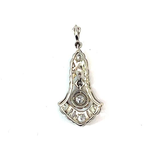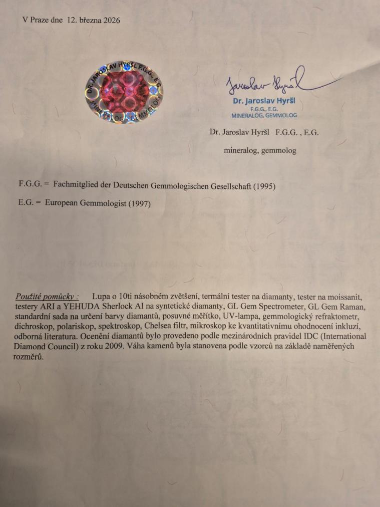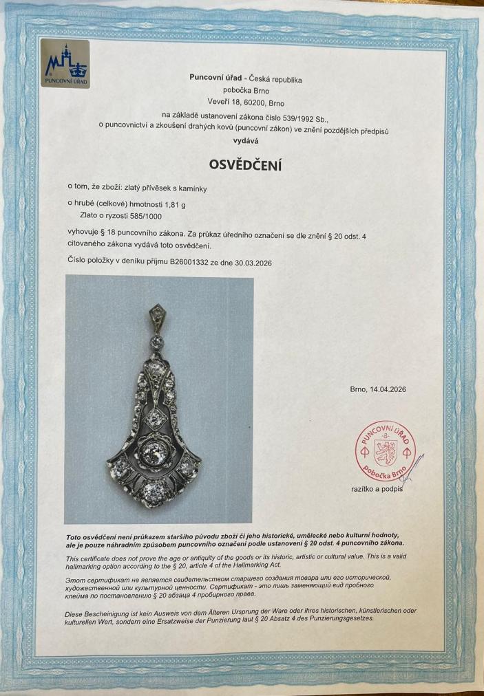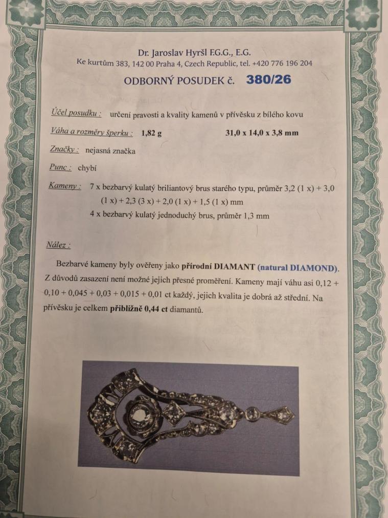 Přívěs z bílého zlata o ryzosti 585/1000, osvědčení z PÚ. Váha 1,81 g, výška včetně očka 31 mm, v nejširším bodě 14 mm. Kámen - přírodní diamant staroevropského brusu - 7 ks, přírodní diamant kulatý jednoduchý brus - 4 ks, všechny dohromady mají cca 0,44 ct.