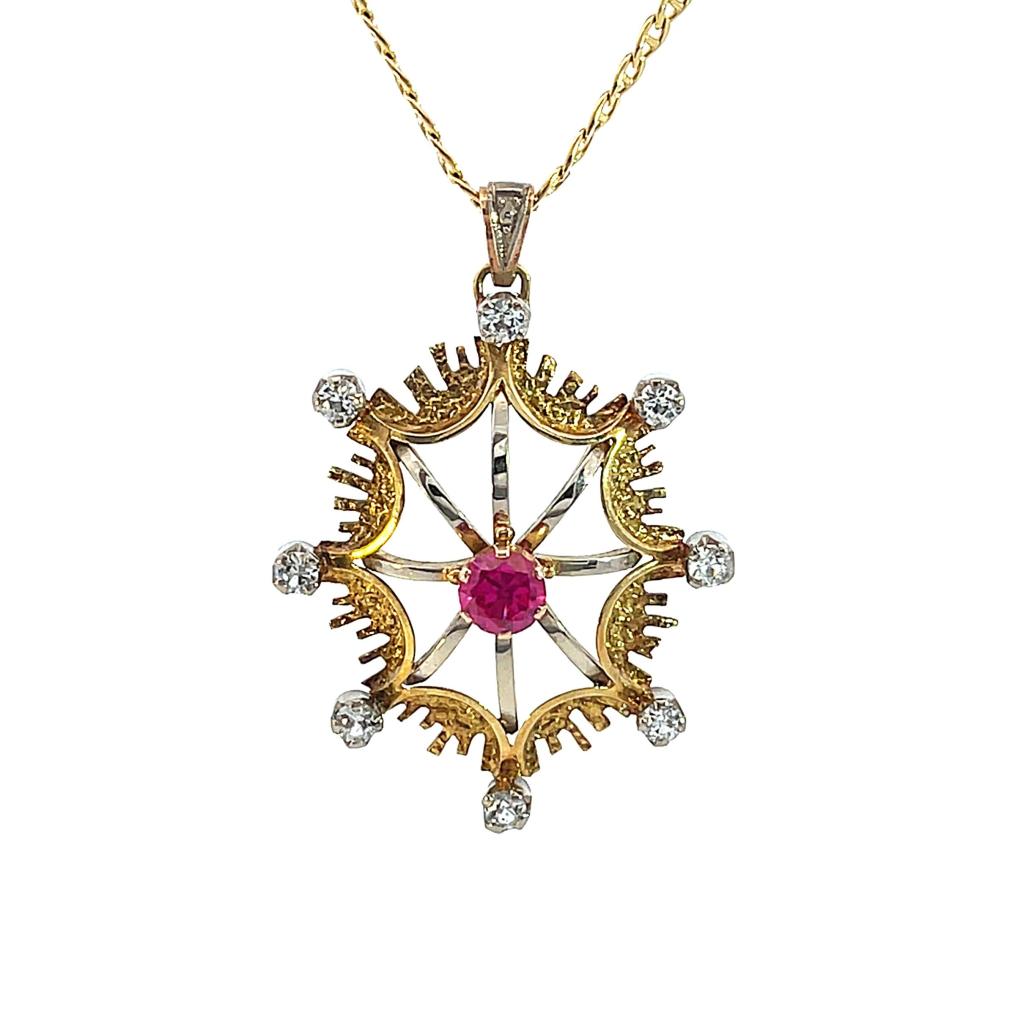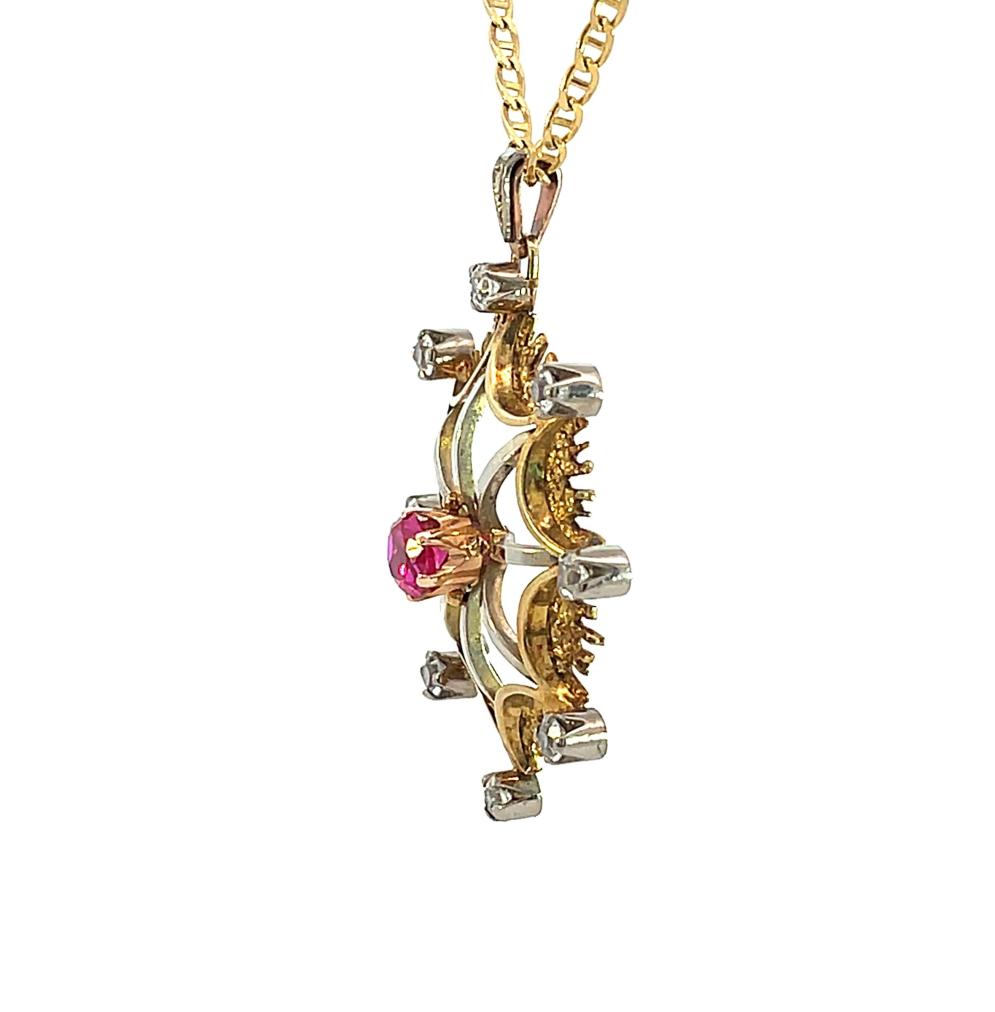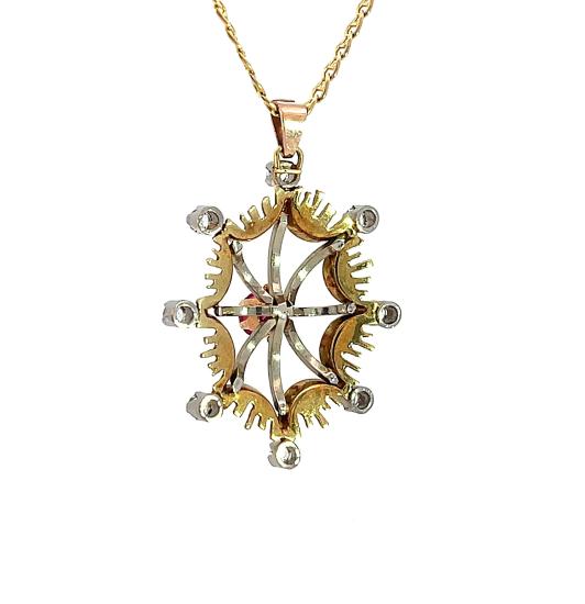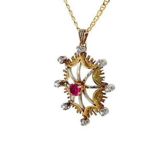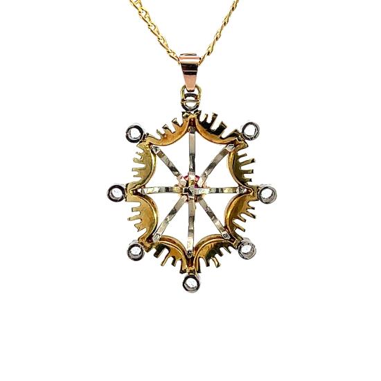 Přívěs z kombinace růžového, žlutého a bílého zlata o ryzosti 585/1000, punc labuť. Váha 8,17 g, výška včetně očka 45 mm, v nejširším bodě 32 mm. Kameny jsou syntetické.