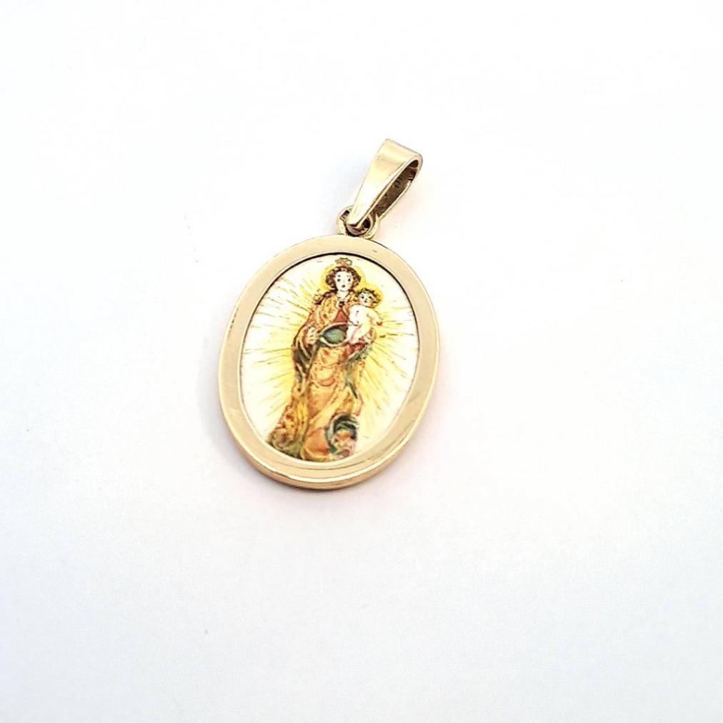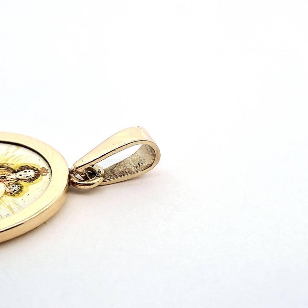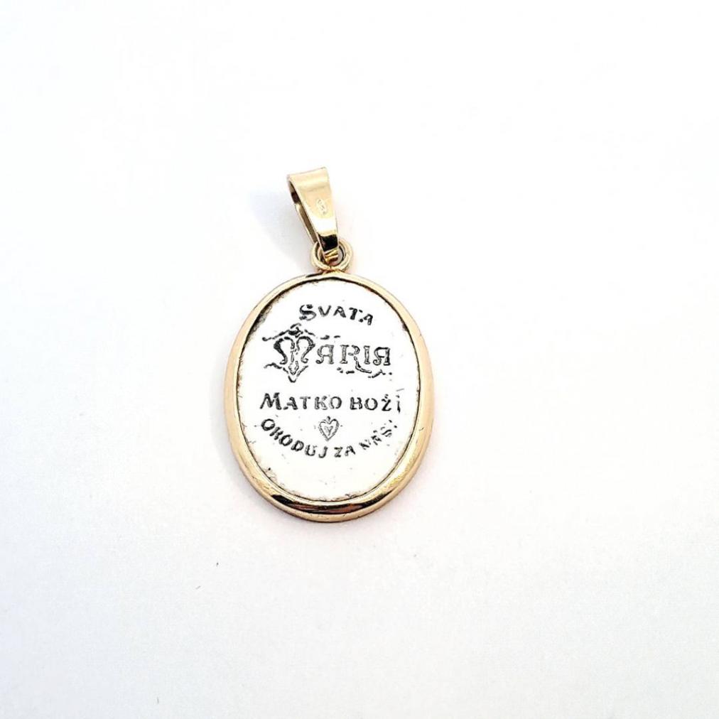 Krásný zlatý přívěs s porcelánovou madonkou ve zlaté obrubě. Ryzost zlata je 585/1000, punc labuť. Celkové rozměry jsou 30 mm na délku, a na šířku měří 16 mm. Šířka obruby je 1,5 mm. Váha 2,90 g.