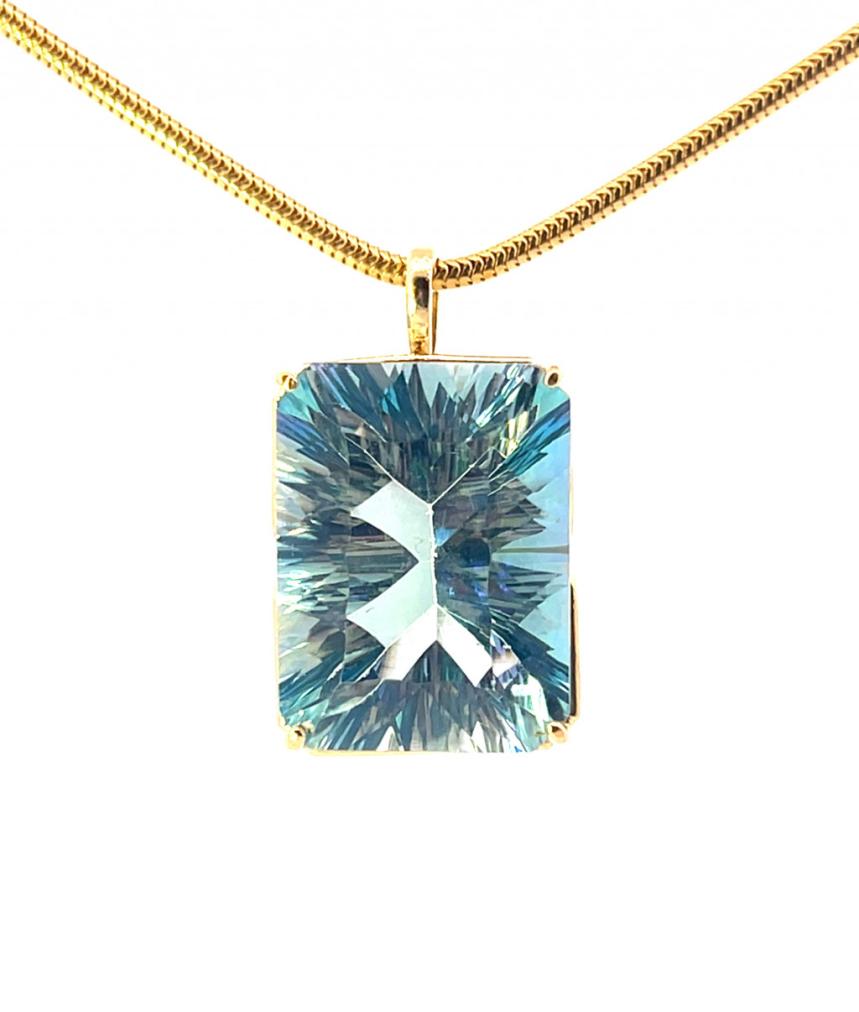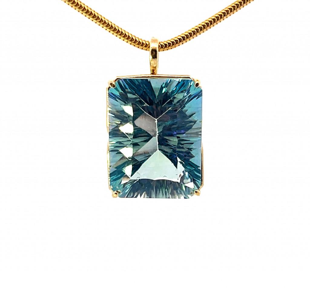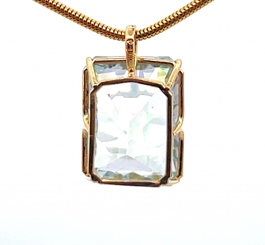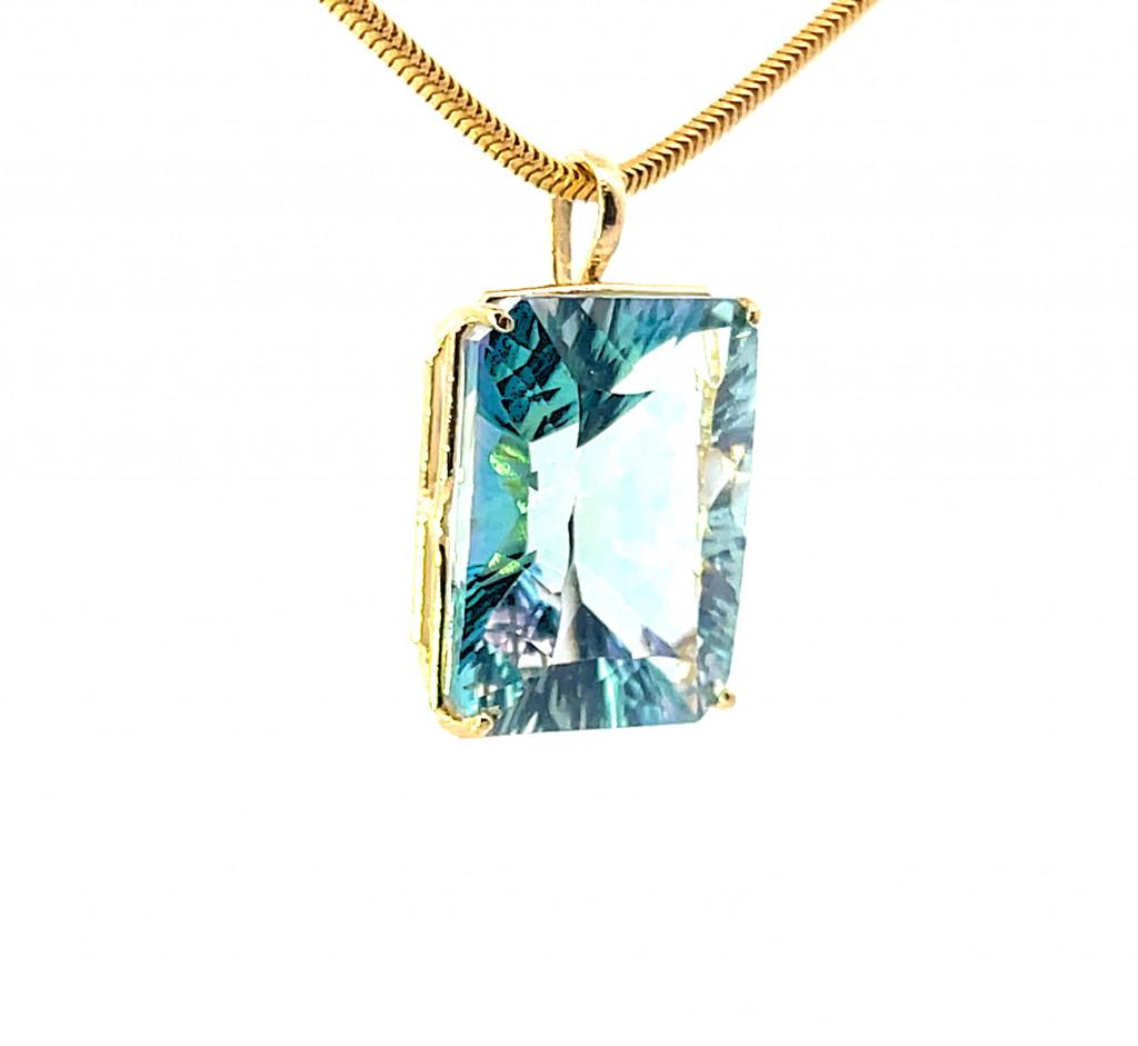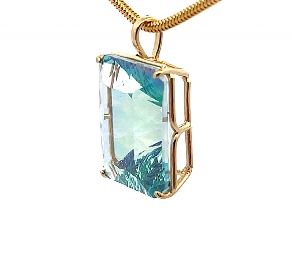 Zlatý přívěs o ryzosti 585/1000, punc labuť. Váha 3,75 g, výška včetně očka 22 mm, rozměr kamene 16 x 12 mm. Kámen je syntetický a pod úhly světla mění odstín na fialovou barvu. Řetízek není součástí přívěsu.