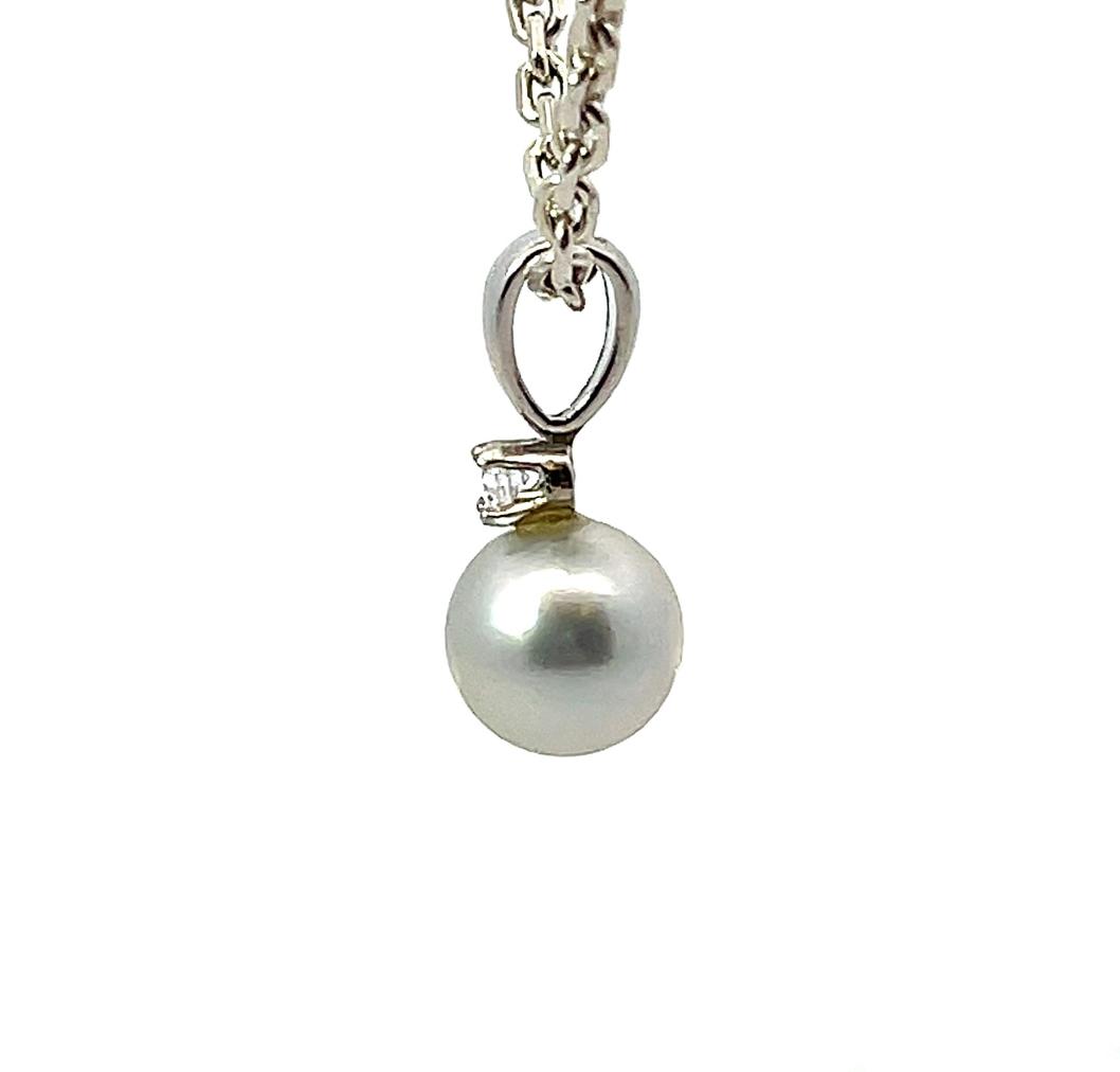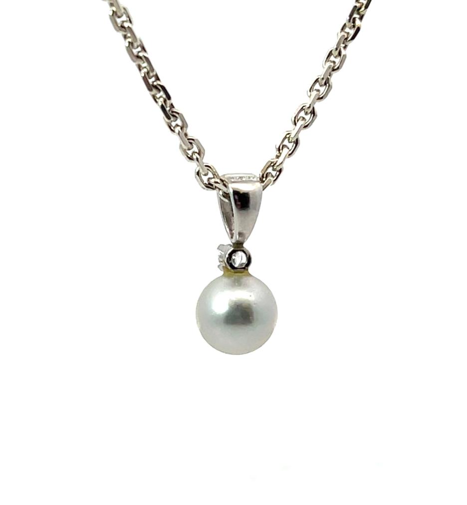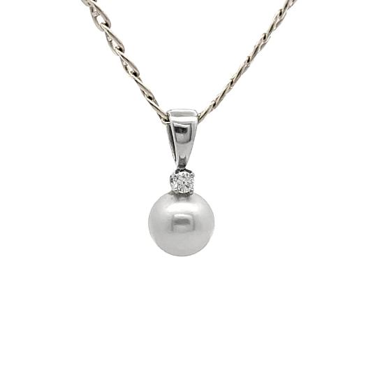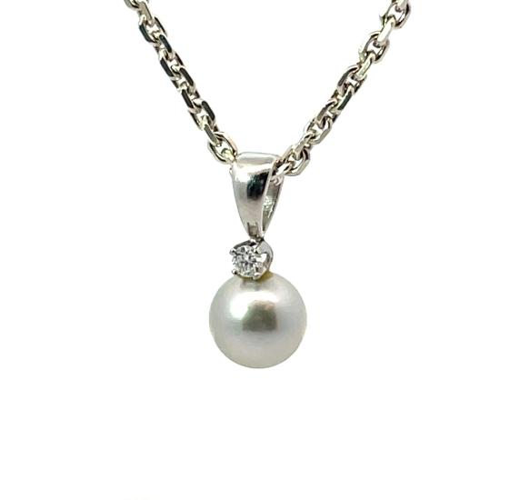 Přívěs z bílého zlata o ryzosti 585/1000, punc labuť. Váha 1,02 g, výška včetně očka 16,5 mm, v nejširším bodě 7,5 mm. Kámen - přírodní diamant briliantového brusu - 1 ks, cca 0,06 ct.