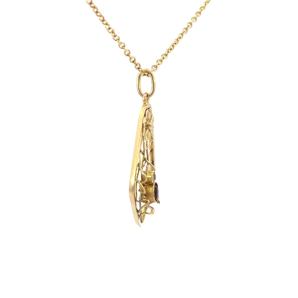 Zlatý přívěs o ryzosti 585/1000, punc čejka. Váha 1,66 g, výška včetně očka 34 mm, v nejširším bodě 17 mm. Kameny jsou syntetické.