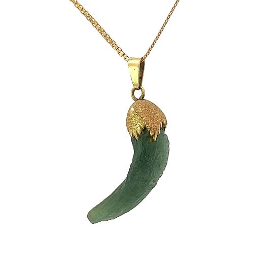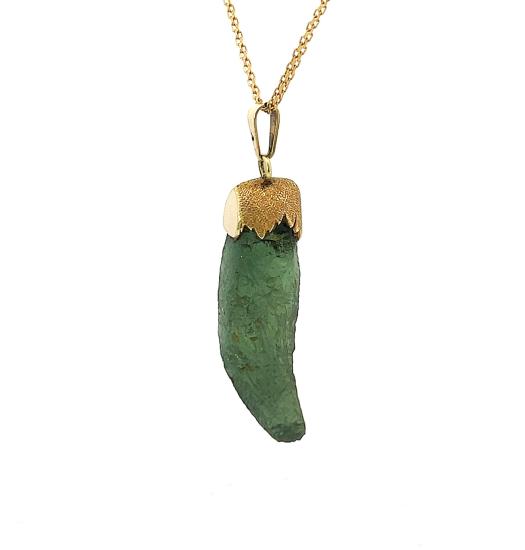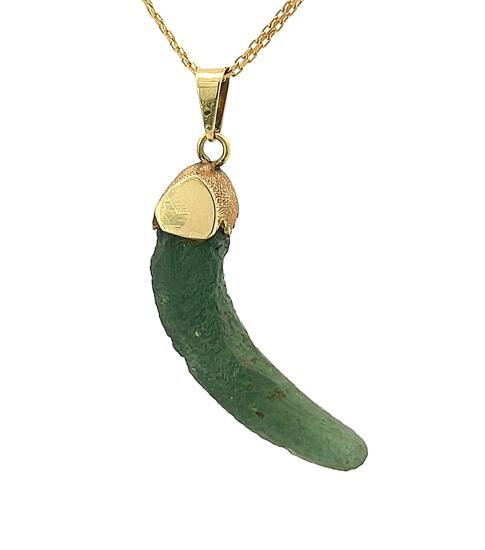 Zlatý přívěs o ryzosti 585/1000, punc labuť. Váha 8,92 g, výška včetně očka 51 mm, v nejširším bodě 13 mm.
