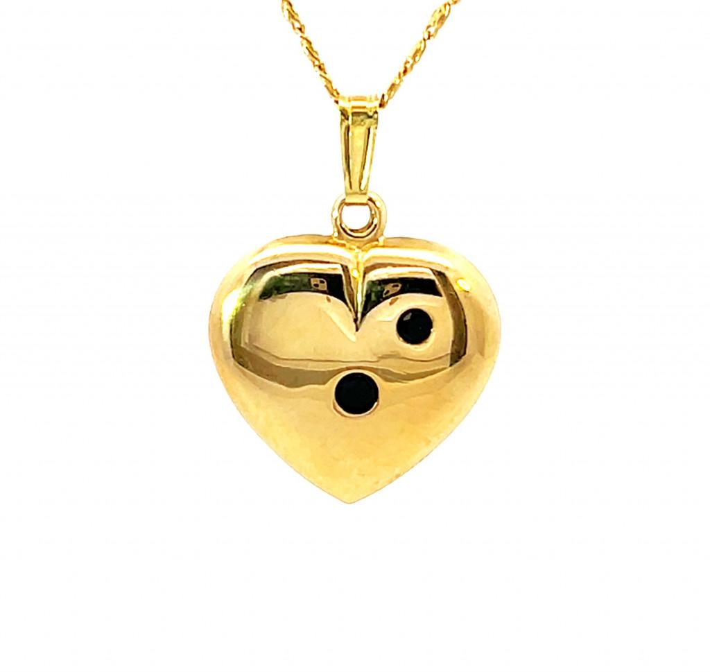 Zlatý přívěs o ryzosti 585/1000, punc labuť. Váha 1,49 g, výška včetně očka 24 mm, v nejširším bodě 17,5 mm. Kameny jsou syntetické.