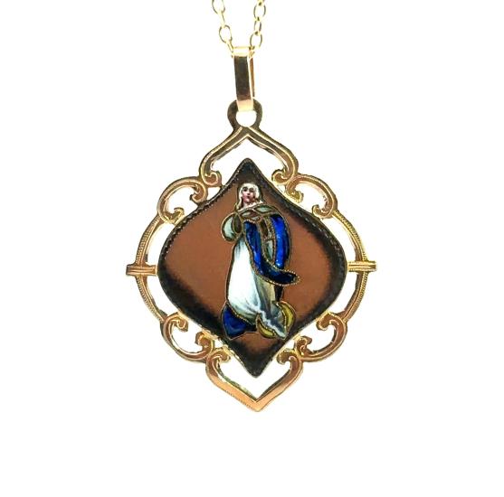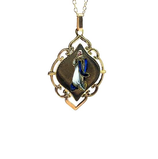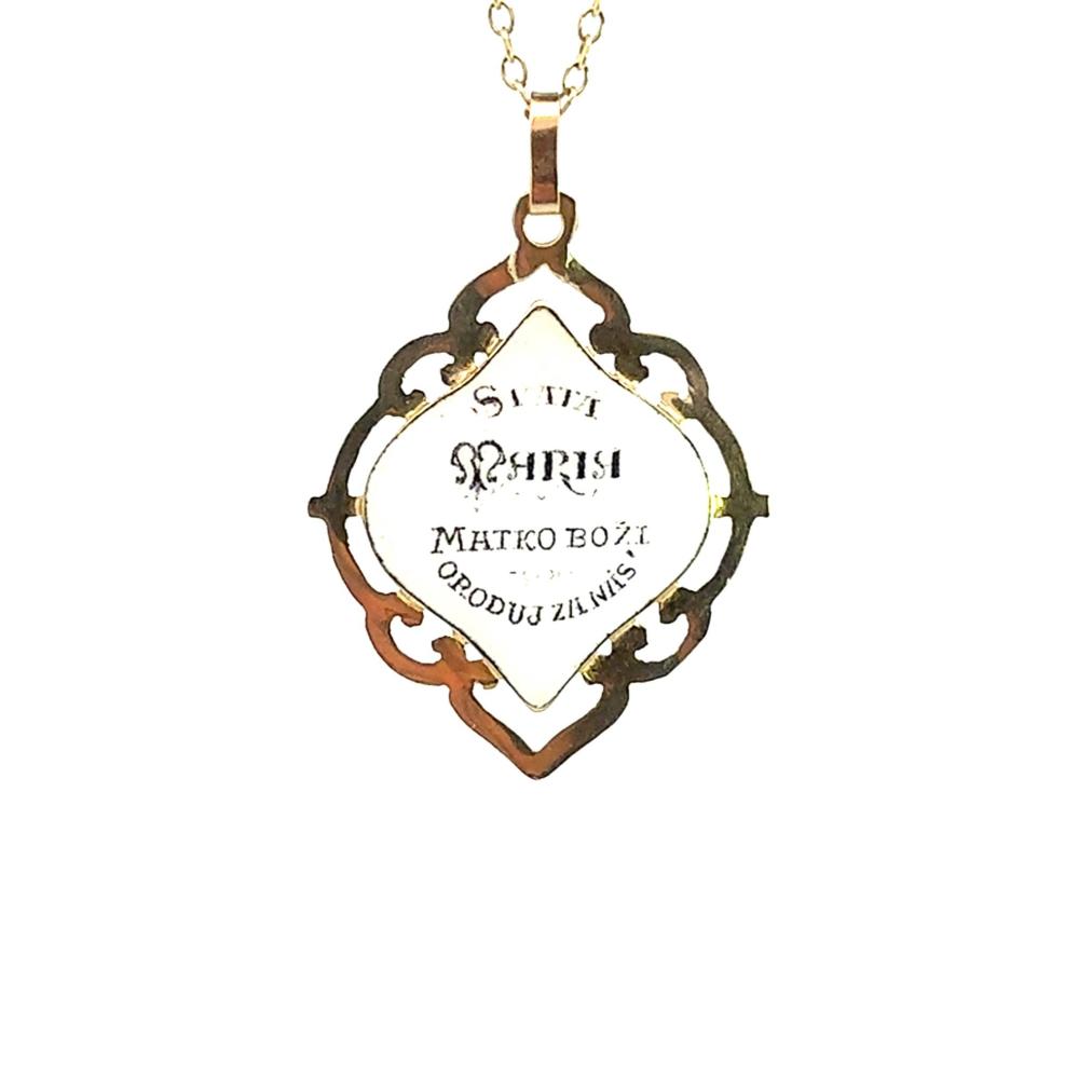 Zlatý přívěs o ryzosti 585/1000, punc labuť. Váha 3,07 g, výška včetně očka 38 mm, v nejširším bodě 25,5 mm. Zlato má v přední části přívěsu po stranách tmavý odstín, viz foto. Písmo z porcelánové destičky je lehce setřené.