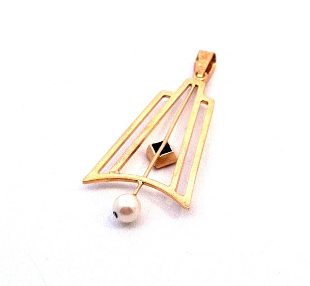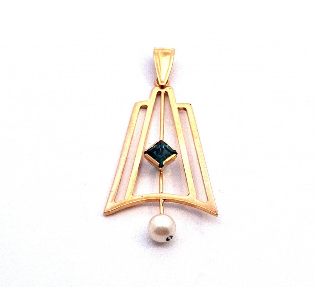 Zlatý přívěs o ryzosti 750/1000, punc kohout. Váha 2,40 g, výška včetně očka 40 mm, průměr perly 4,5 mm. Kámen je syntetický.