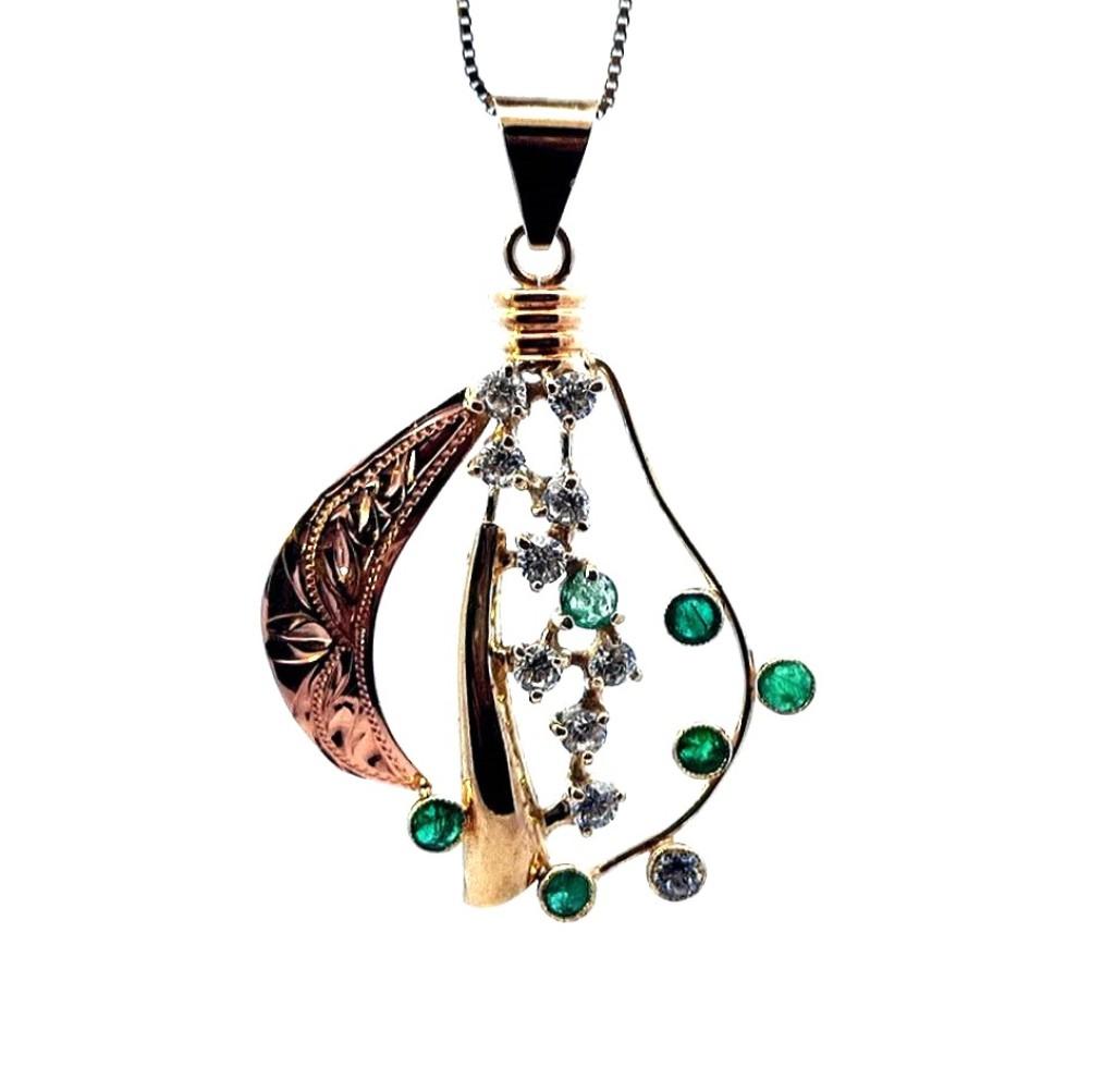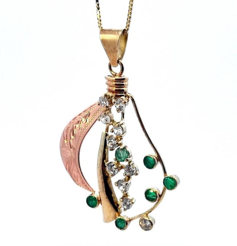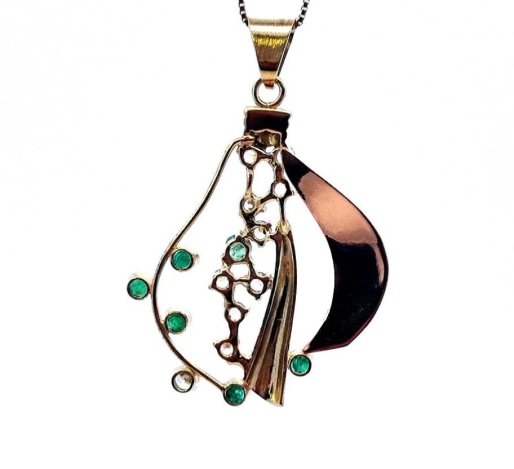 Zlatý přívěs o ryzosti 585/1000, punc labuť. Váha 5,85 g, výška včetně očka 48 mm, v nejširším bodě 32 mm. Kameny jsou syntetické.