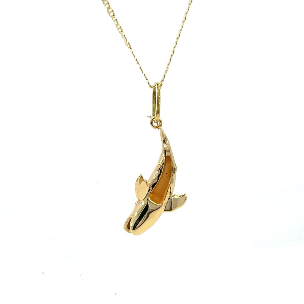 Zlatý přívěs o ryzosti 585/1000, punc labuť. Váha 5,52 g, výška včetně očka 37 mm, v nejširším bodě 13 mm.