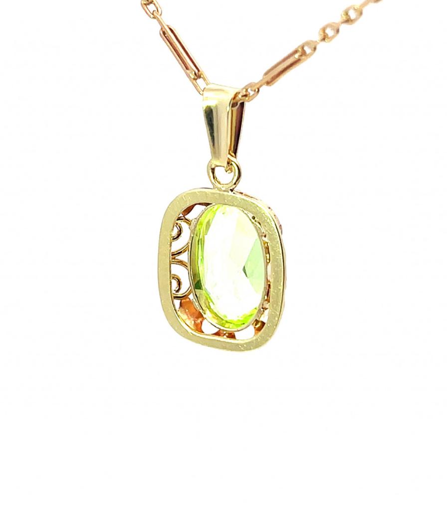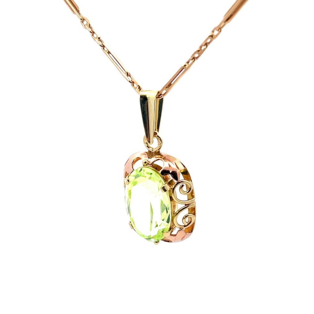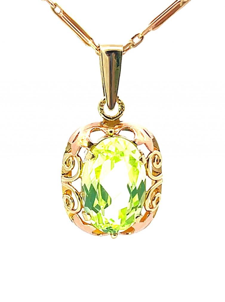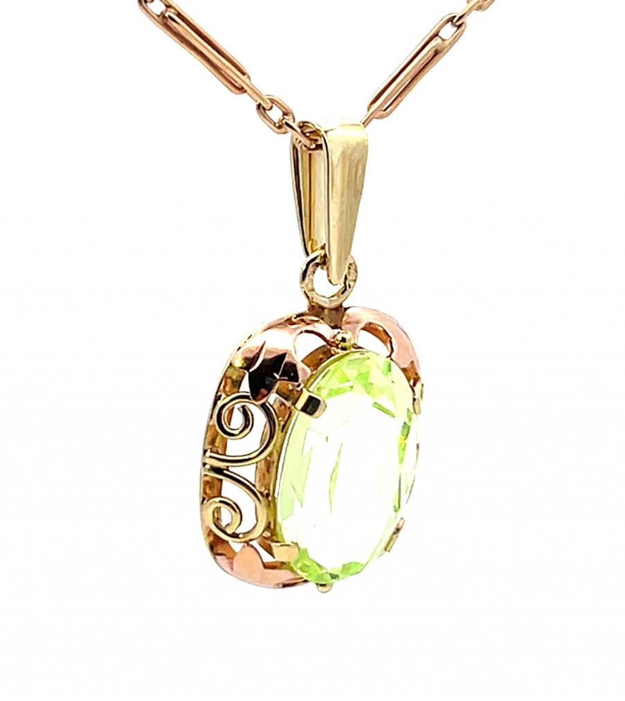 Přívěsek z kombinace žlutého a růžového zlata o ryzosti 585/1000 s puncem čejky. Oválný rám s ornamenty přidržuje středový zelený kámen. Rozměry kamene jsou 14 x 9 mm. Výška včetně očka je 27 mm. V nejširším bodě měří 14 mm. Váha přívěsku je 3,25 g.