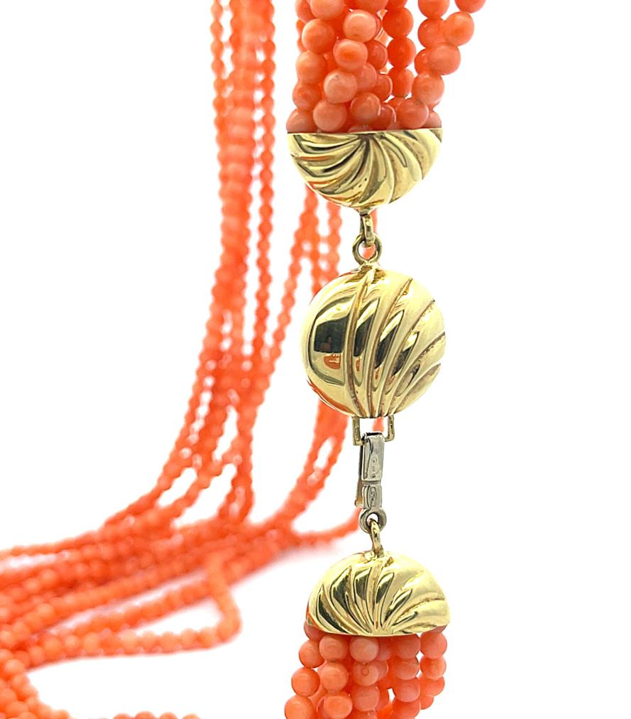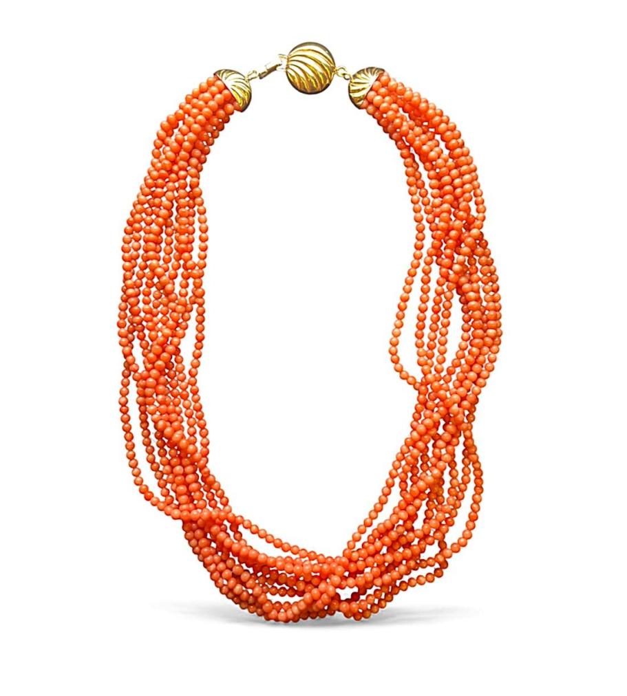 Náhrdelník z korálu se zlatým zapínáním, uzávěr o ryzosti 750/1000, punc kohout. Váha 95,03 g, délka 50 cm, v nejširším bodě 38 mm, šířka korálu (= jedné řady) 4 mm.