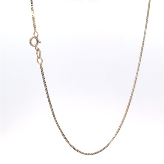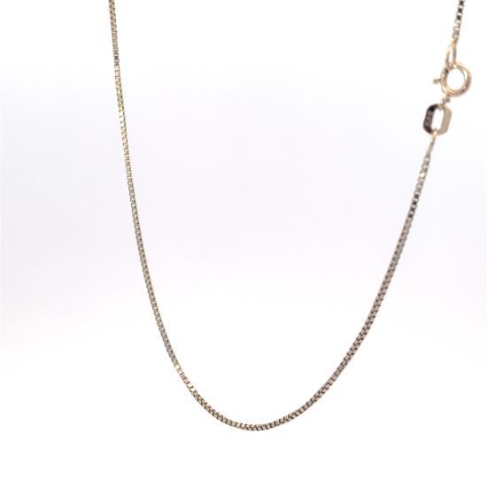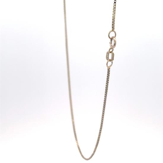 Řetízek z bílého zlata o ryzosti 585/1000, punc labuť. Váha 2,15 g, délka 46,7 cm, v nejširším bodě 1 mm.