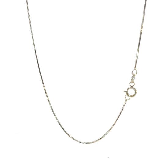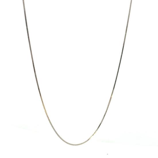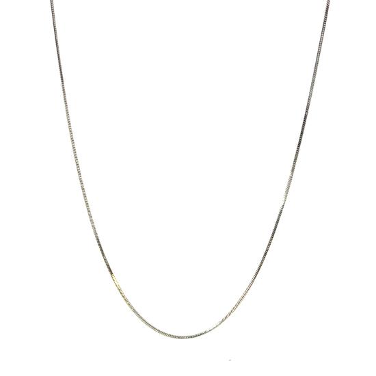 Řetízek z bílého zlata o ryzosti 585/1000, punc labuť. Váha 2,15 g, délka 61,3 cm, v nejširším bodě 0,5 mm. Řetízek je na pár místech velmi mírně prohnutý - nese známky po nošení.
