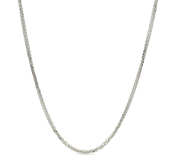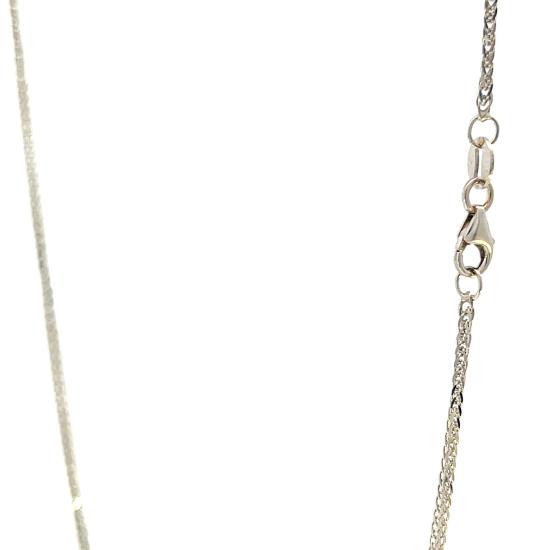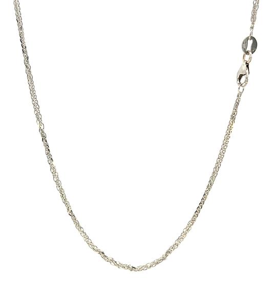 Řetízek z bílého zlata o ryzosti 585/1000, punc labuť. Váha 3,48 g, délka 56,5 cm, v nejširším bodě 1 mm.